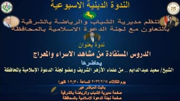ومن جانبهأشار الدكتور محمود عبد العظيم وكيل وزارة الشباب والرياضةإلى أنه تحت رعاية وزير الشباب والرياضة ومحافظ الشرقيةوبالتعاون مع لجنة الدعوة الإسلامية قامت المديرية بتنظيم ندوه تثقيفية بعنوان " الدروس المستفادة من مشاهد الاسراء والمعراج " اليوم الثلاثاء الموافق 14 فبراير 2023 في تمام الساعة الثانية عشر والنصف ظهراً عن طريق البث المباشر على صفحة مكتب الربط الإلكتروني والتحول الرقمي لوزارة الشباب والرياضة علي الفيس بوك وكذلك صفحة مديرية الشباب والرياضة بالشرقية وصفحة لجنة الدعوة الإسلامية بالمحافظة من خلال الروابط التالية :