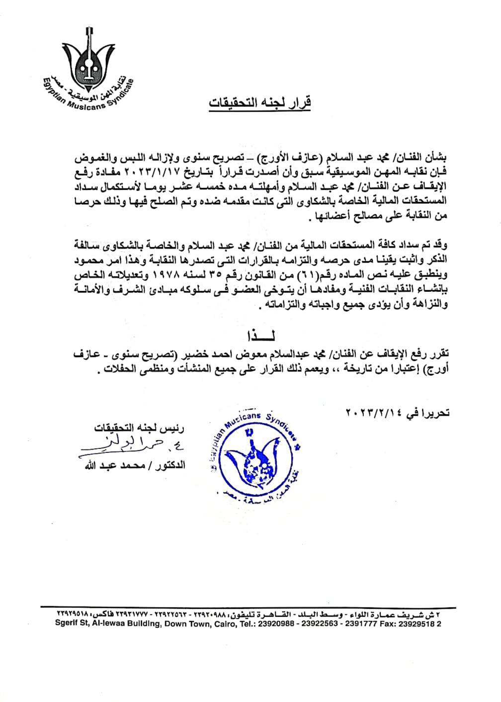 وجاء نص البيان كالأتي : شأن الفنان/ محمد عبد السلام (عازف الأورج) – تصريح سنوى ولإزاله اللبس والغموض ، فإن نقابـه المهن الموسيقية سبق وأن أصدرت قراراً بتـاريخ ۲۰۲۳/۱/۱۷ مفـادة رفع الإيقـاف عـن الفنـان/ محمد عبـد السـلام وأمهلتـه مـده خمسـه عشـر يـومـا لأستكمال سـداد ، المستحقات المالية الخاصة بالشكاوى التي كانت مقدمـه ضـده وتم الصلح فيهـا وذلك حرصا من النقابة على مصالح أعضائها .