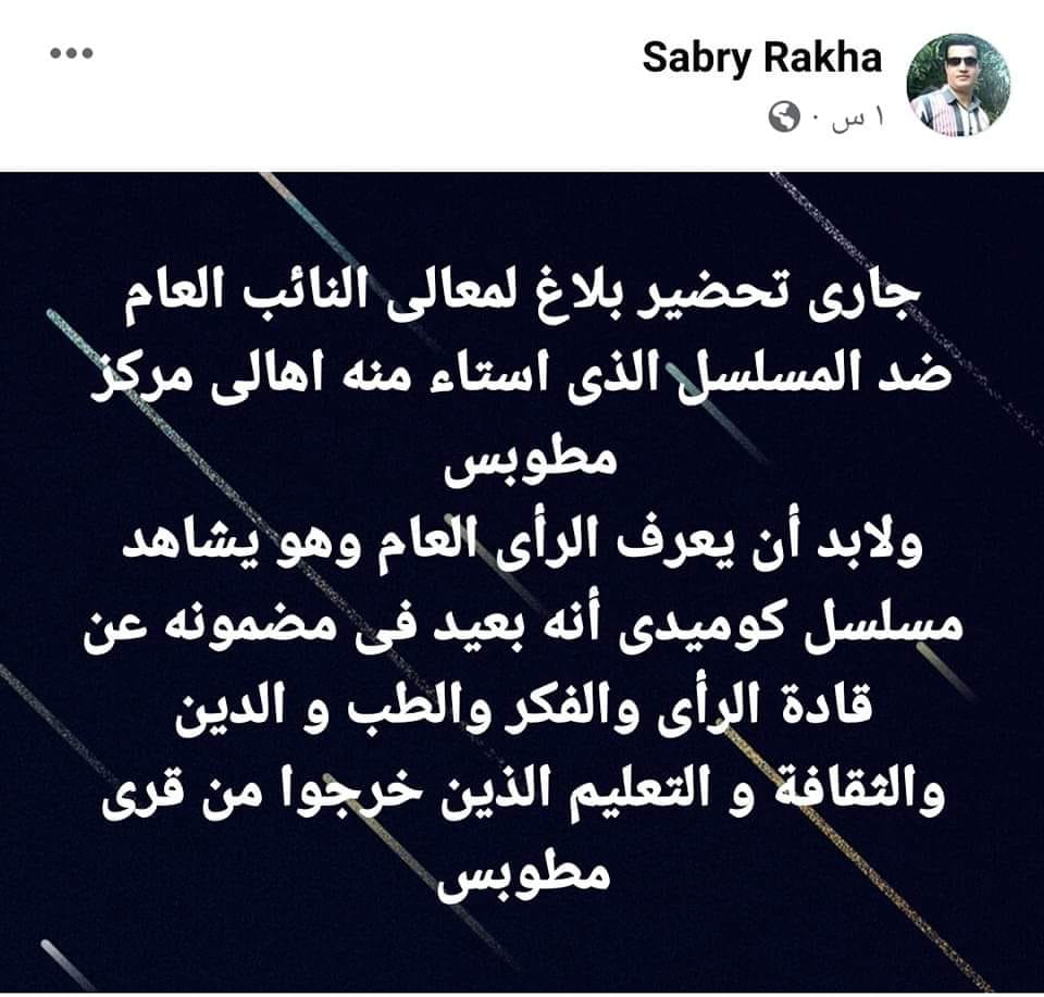 وأضاف: لكن انا ضد إننا نتعامل مع الفن بالأفق الضيق ده .. الفن بيتخيل أحداث في مكان و زمن .. و صناع المسلسل كاتبين في التتر إن الأحداث لا تمت للواقع بصلة .. و إنما محض خيال، يبقى خلاص.