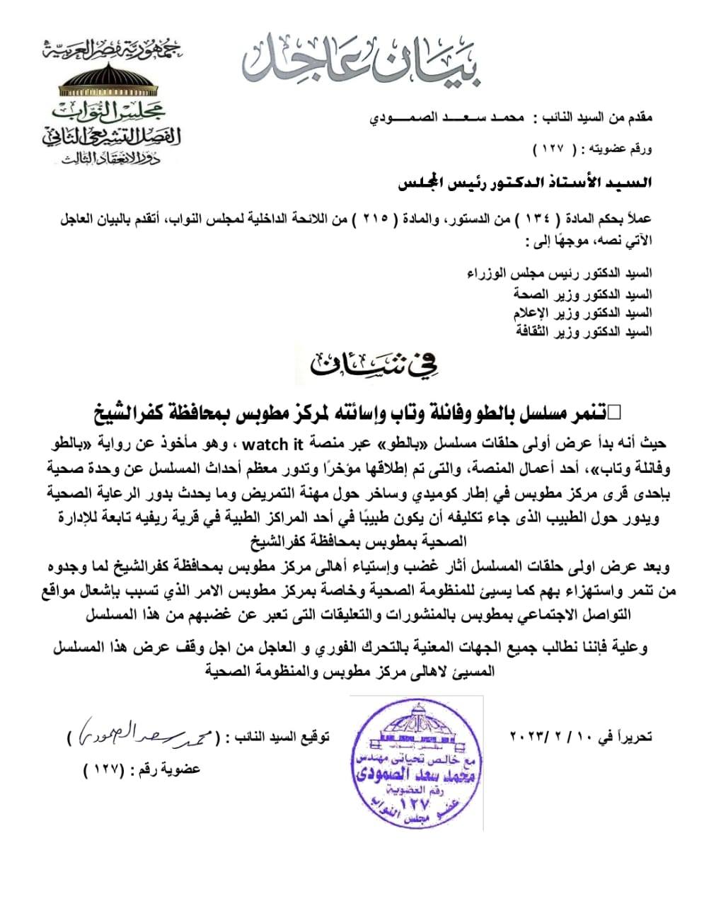 وتفاقمت الأزمة بعد ساعات من تداول المسلسل على صفحات التواصل الإجتماعي ، إلى أن وصلت إلى مجلس النواب، حيث قام أحد أعضاء المجلس برفع بيان عاجل إلى رئيس الوزراء لوقف المسلسل بعد التنمر والأستهزاء بأهالى المركزعلى حد وصفه فى البيان.