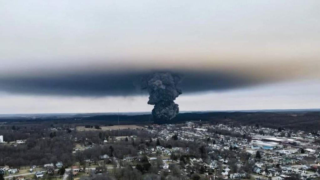 وخرج قطار ينقل صهاريج مادة كيميائية قابلة للاشتعال ومسببة للسرطان عن مسارها بالقرب من بلدة صغيرة في ايست باليستين، أوهايو، يوم الجمعة 3 فبراير، مما تسبب في انفجار تسبب في سحابة فطر سوداء ضخمة فوق المنطقة.