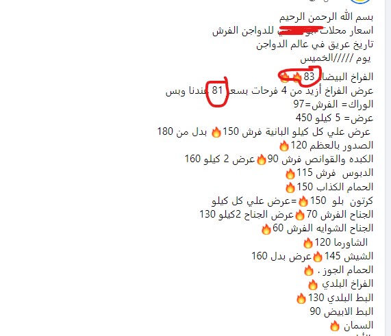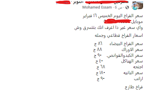 - سعر كرتونة البيض الأبيض وصلت إلى 109-113 جنيهًا في المزرعة، وبين 117-121 جنيهًا للمستهلك.