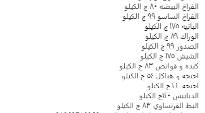 - الفراخ البيضاء: يبدأ السعر من 77 جنيهًا في المزرعة، و81 جنيهًا وقد يصل إلى 87 جنيهًا للكيلو للمستهلك في بعض المناطق.