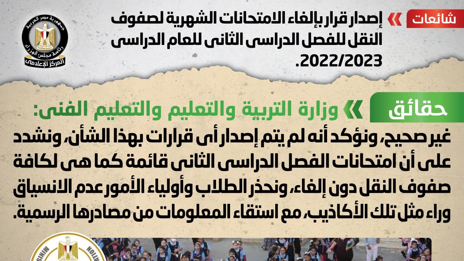 وقام المركز الإعلامي لمجلس الوزراء بالتواصل مع وزارة التربية والتعليم والتعليم الفني، والتي نفت تلك الأنباء، مُؤكدةً أنه لا صحة لإصدار قرار بإلغاء الامتحانات الشهرية لصفوف النقل للفصل الدراسي الثاني للعام الدراسي 2022/2023، وأنه لم يتم إصدار أي قرارات بهذا الشأن، مُشددةً على أن امتحانات الفصل الدراسي الثاني قائمة كما هي لكافة صفوف النقل دون إلغاء، مُحذرةً الطلاب وأولياء الأمور عدم الانسياق وراء مثل تلك الأكاذيب، مع استقاء المعلومات من مصادرها الرسمية.