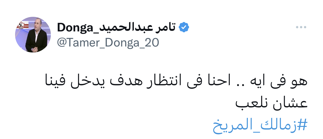 وكتب تامر عبد الحميد في تويتة له: “هو فى ايه .. احنا فى انتظار هدف يدخل فينا عشان نلعب #زمالك_المريخ”.