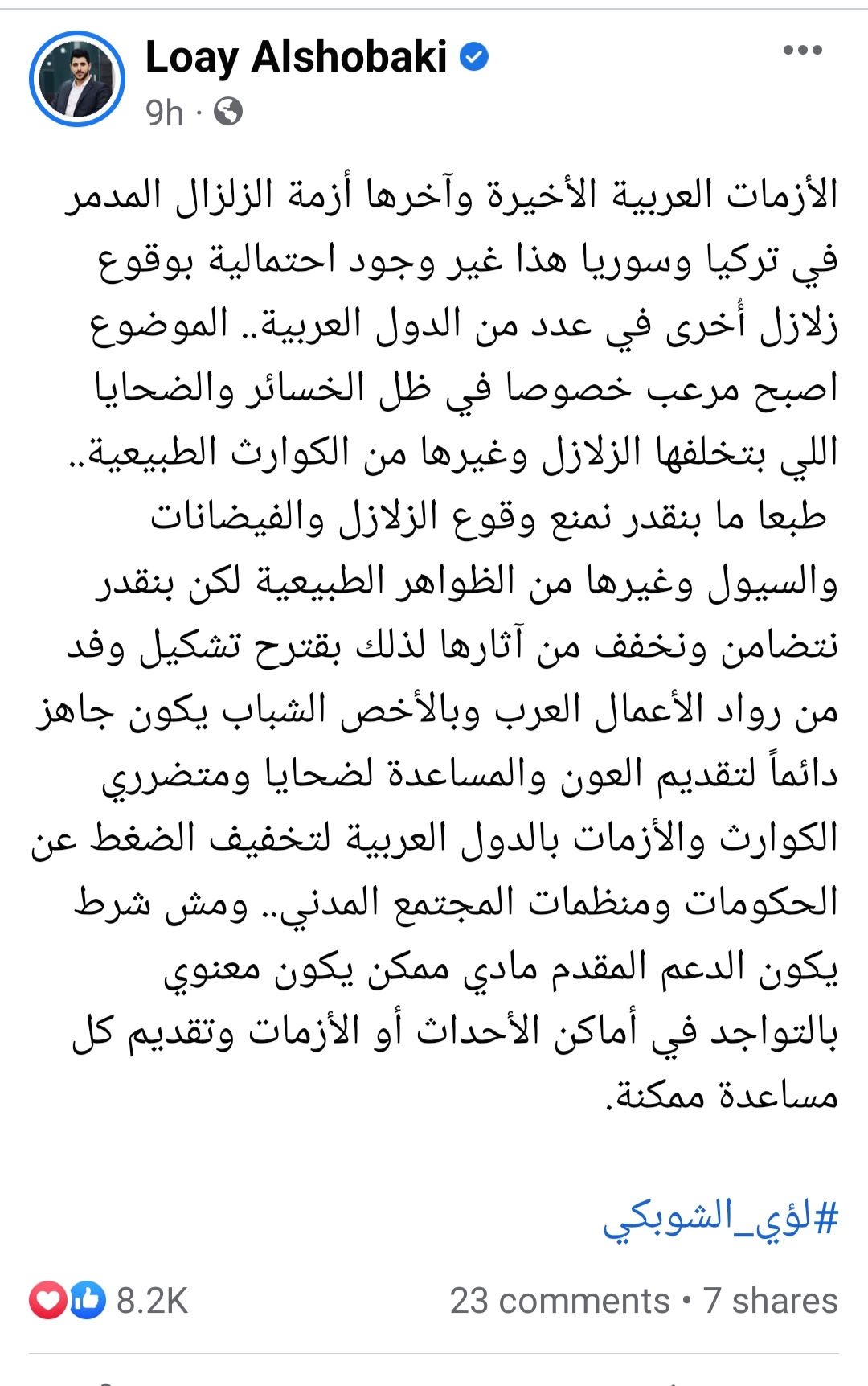 قال لؤي في منشوره المتداول: "الأزمات العربية الأخيرة وآخرها أزمة الزلزال المدمر في تركيا وسوريا دا غير وجود احتمالية بوقوع زلازل تانية في عدد من الدول العربية.. الموضوع بقى مرعب خصوصا في ظل الخسائر والضحايا اللي بتخلفها الزلازل وغيرها من الكوارث الطبيعية"