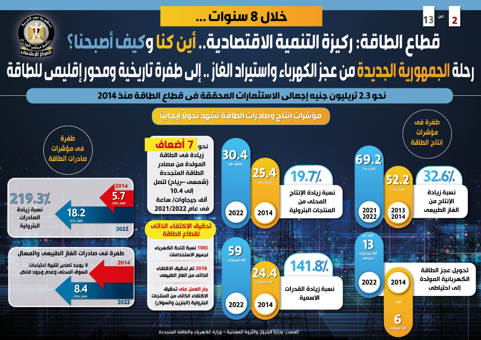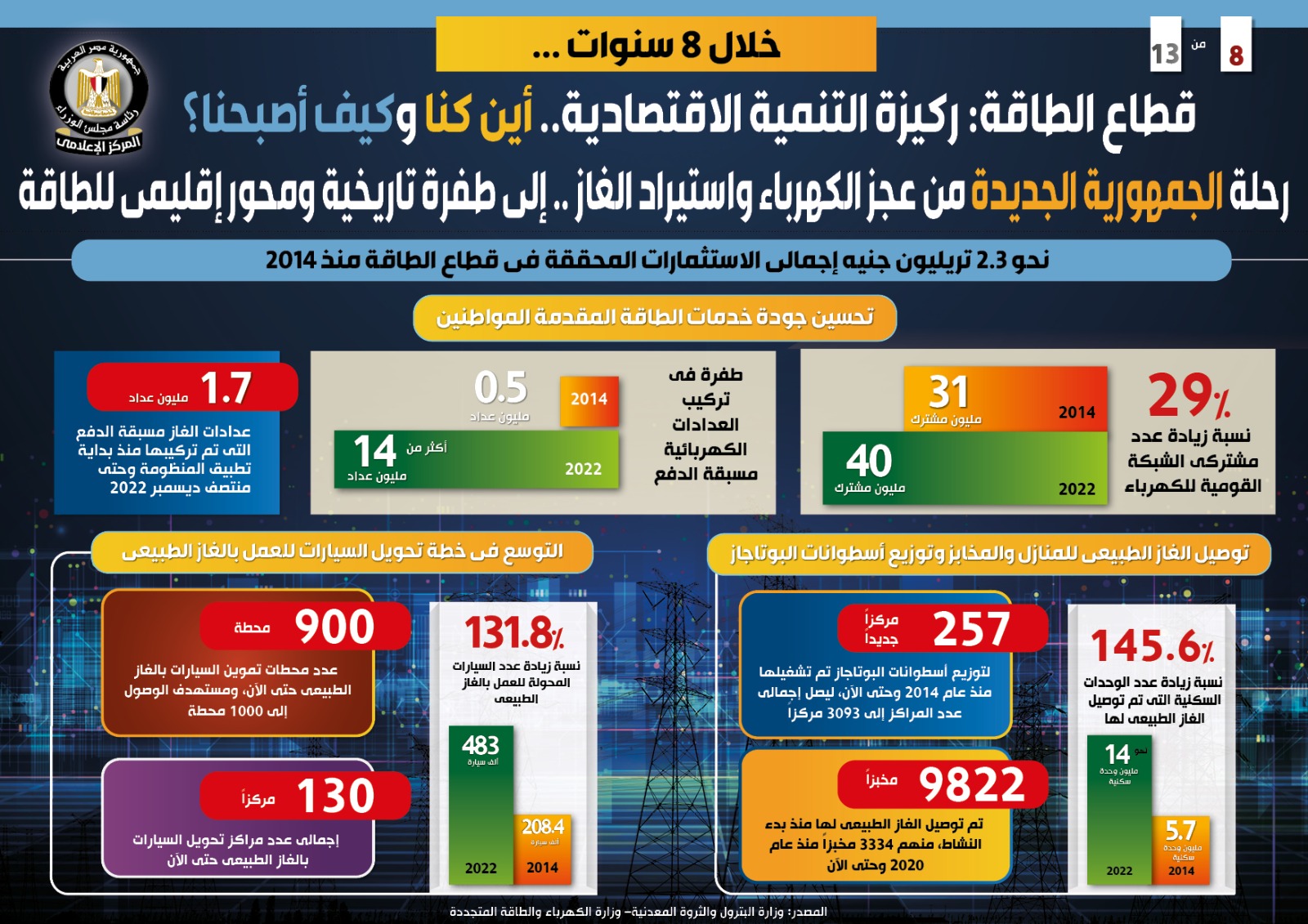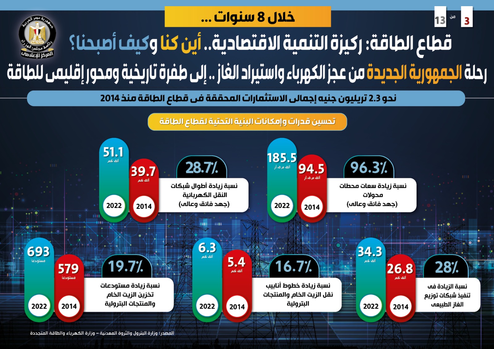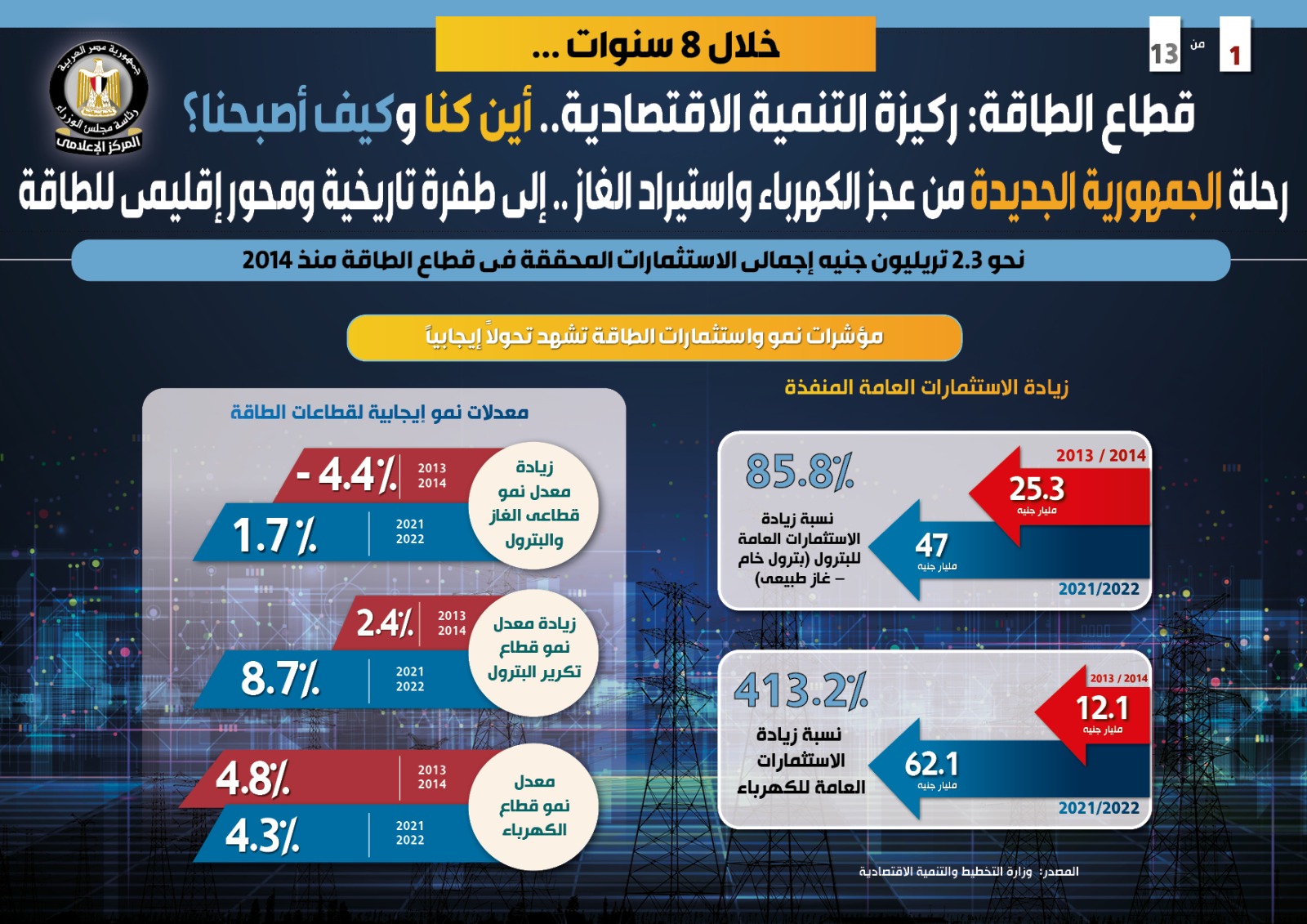 وفي هذا الصدد أصدر المركز الإعلامي لمجلس الوزراء، تقريراً تضمن إنفوجرافات تسلط الضوء على قطاع الطاقة كركيزة للتنمية الاقتصادية خلال 8 سنوات، ورحلة الجمهورية الجديدة من عجز الكهرباء واستيراد الغاز إلى طفرة تاريخية ومحور إقليمي للطاقة، حيث بلغ إجمالي الاستثمارات المحققة في القطاع منذ 2014 نحو 2.3 تريليون جنيه، وذلك في إطار سلسلة تقارير "أين كنا وكيف أصبحنا؟".