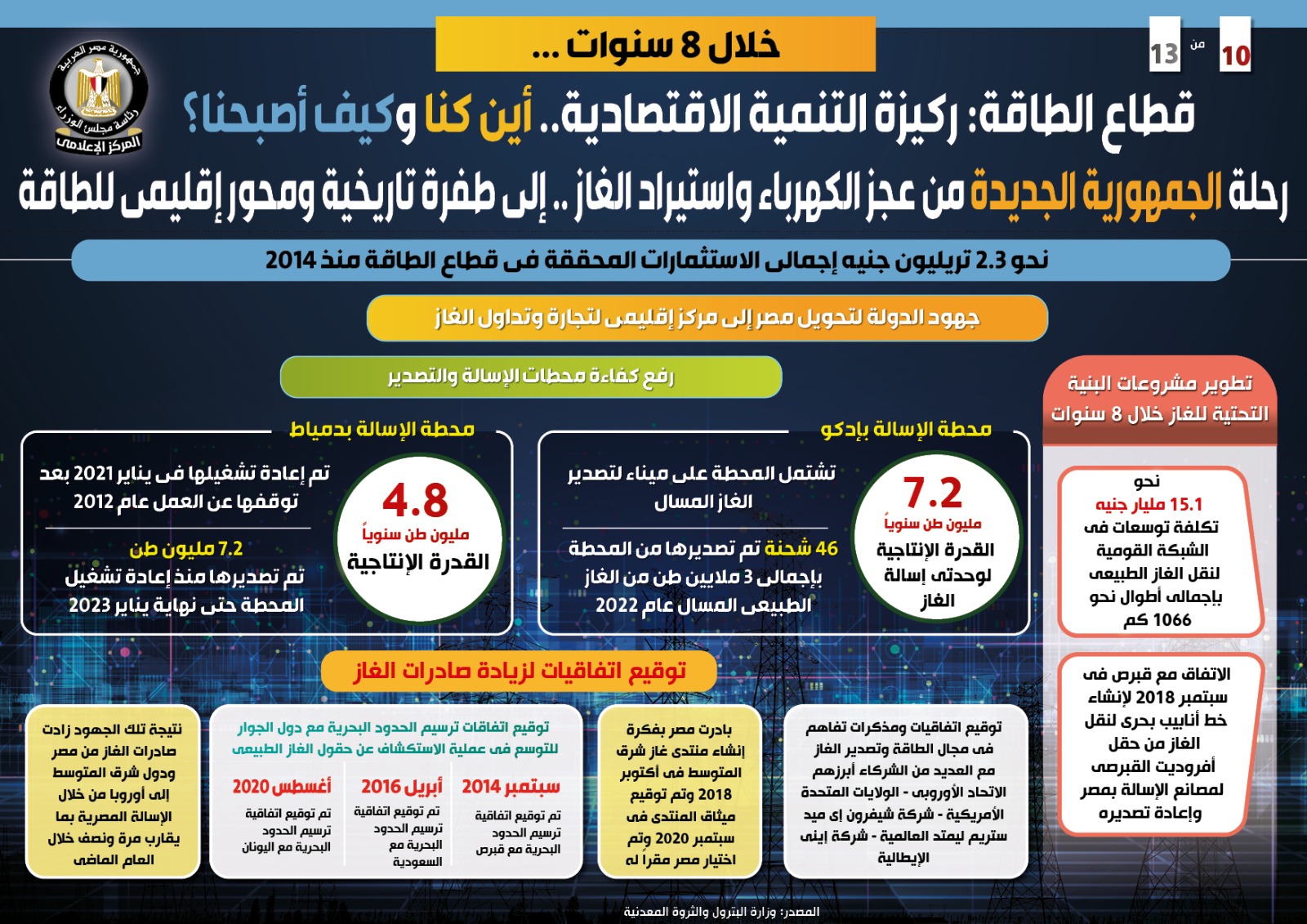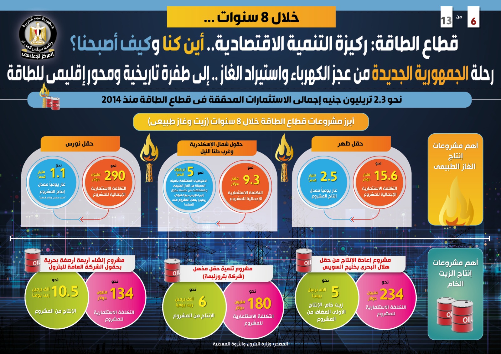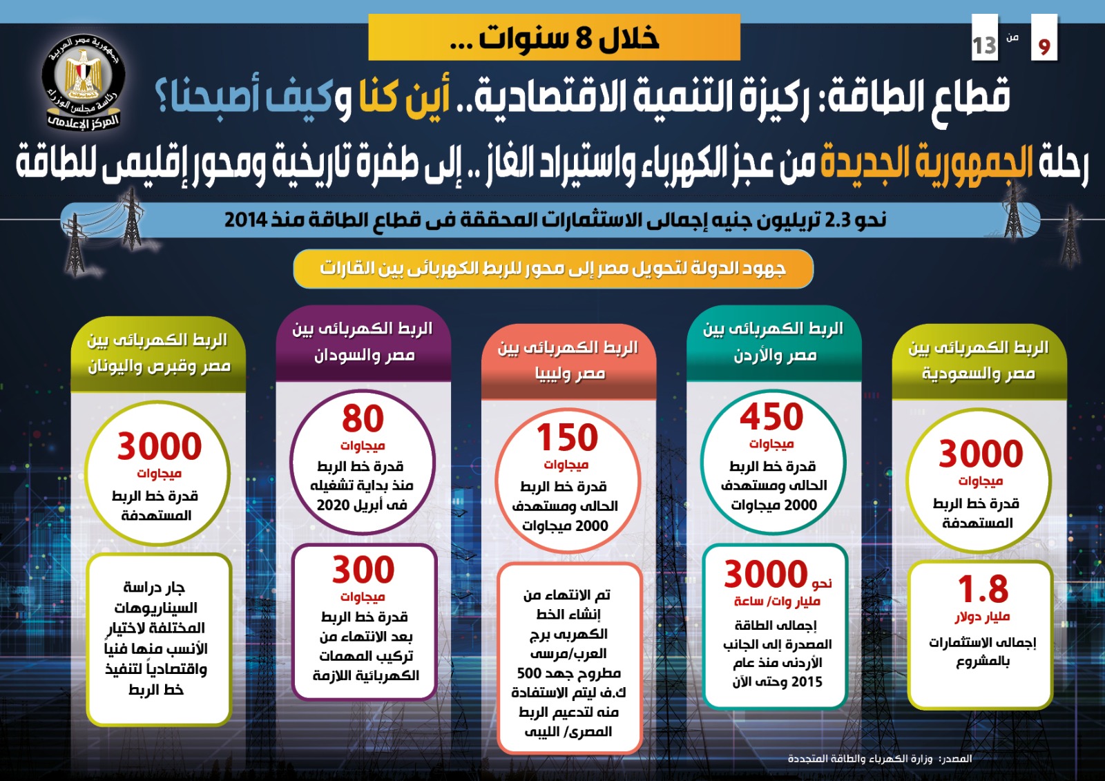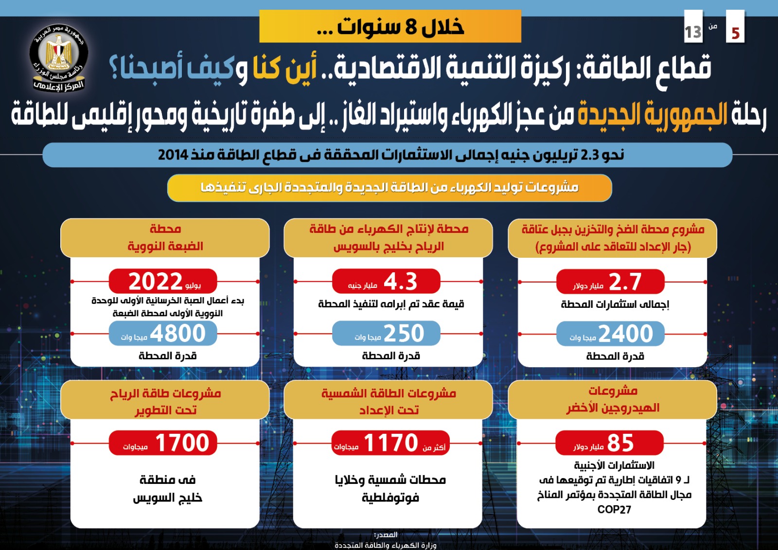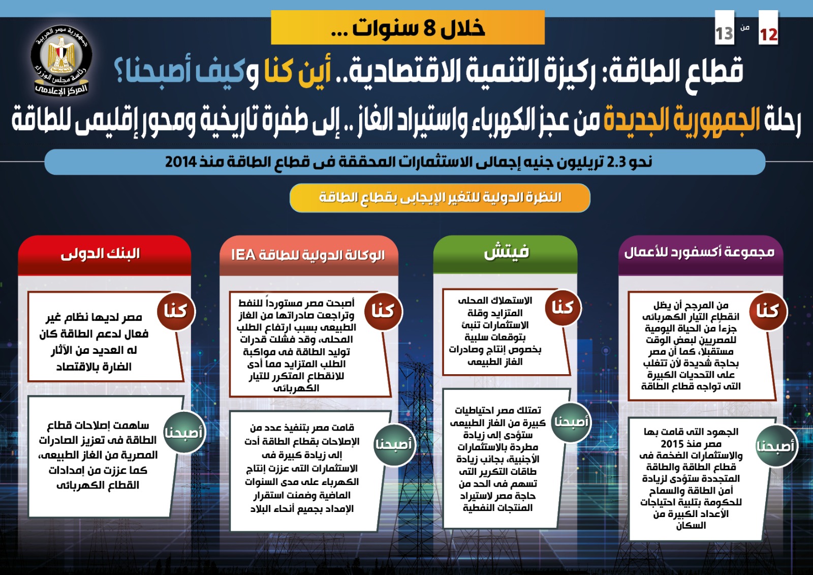 وفي هذا الصدد أصدر المركز الإعلامي لمجلس الوزراء، تقريراً تضمن إنفوجرافات تسلط الضوء على قطاع الطاقة كركيزة للتنمية الاقتصادية خلال 8 سنوات، ورحلة الجمهورية الجديدة من عجز الكهرباء واستيراد الغاز إلى طفرة تاريخية ومحور إقليمي للطاقة، حيث بلغ إجمالي الاستثمارات المحققة في القطاع منذ 2014 نحو 2.3 تريليون جنيه، وذلك في إطار سلسلة تقارير "أين كنا وكيف أصبحنا؟".