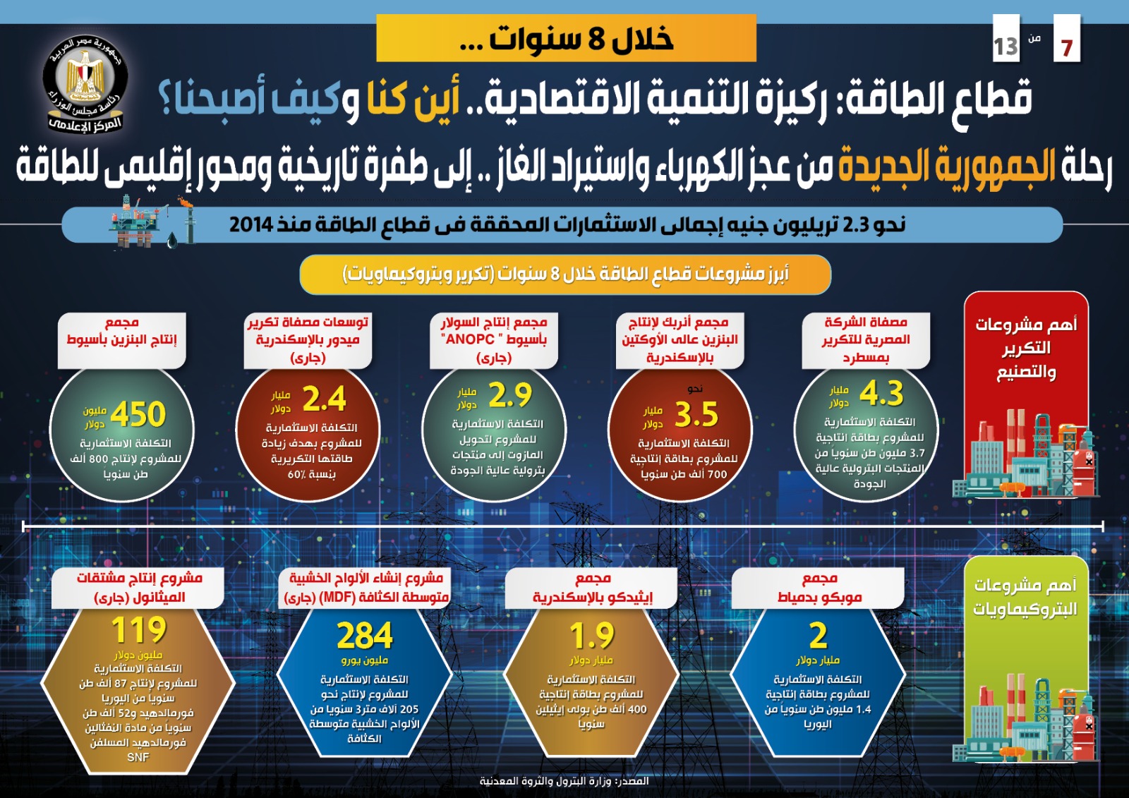 وبالنسبة لأبرز مشروعات قطاع الطاقة خلال 8 سنوات (تكرير وبتروكيماويات)، أوضح التقرير أن من أهم مشروعات التكرير والتصنيع، مجمع أنربك لإنتاج البنزين عالي الأوكتين بالإسكندرية والذي بلغت تكلفته الاستثمارية نحو 3.5 مليار دولار، وبطاقة إنتاجية 700 ألف طن سنوياً.