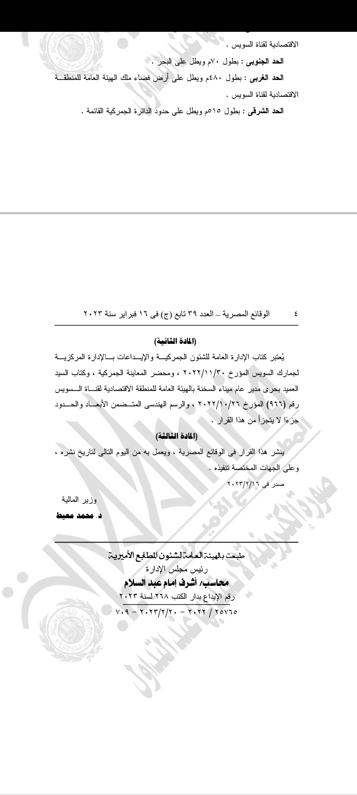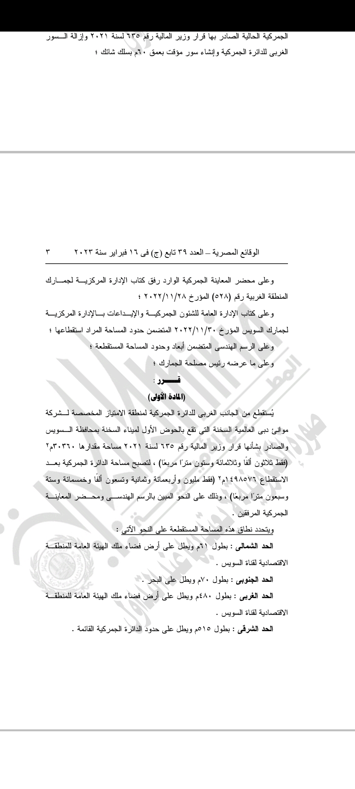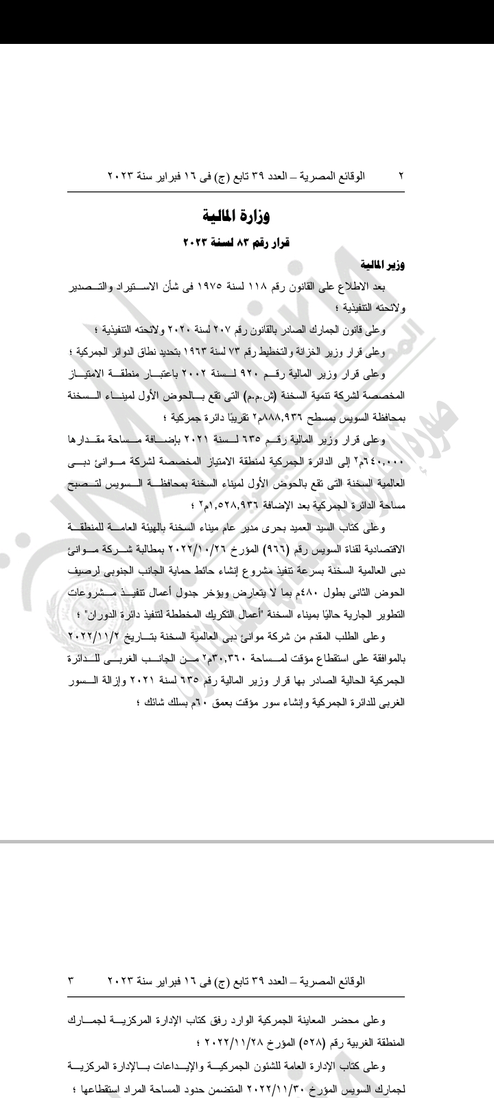 نشرت الجريدة الرسمية في عددها الصادر في ١٦ فبراير ٢٠٢٣، قرار وزير المالية رقم ٨٣ لسنة ٢٠٢٣، و الخاص بشأن استقطاع من الجانب الغربي للدائرة الجمركية لمنطقة الامتياز المخصص لإحدى الشركات العالمية، التي تقع بالحوض الأول لميناء السخنة بمحافظة السويس.