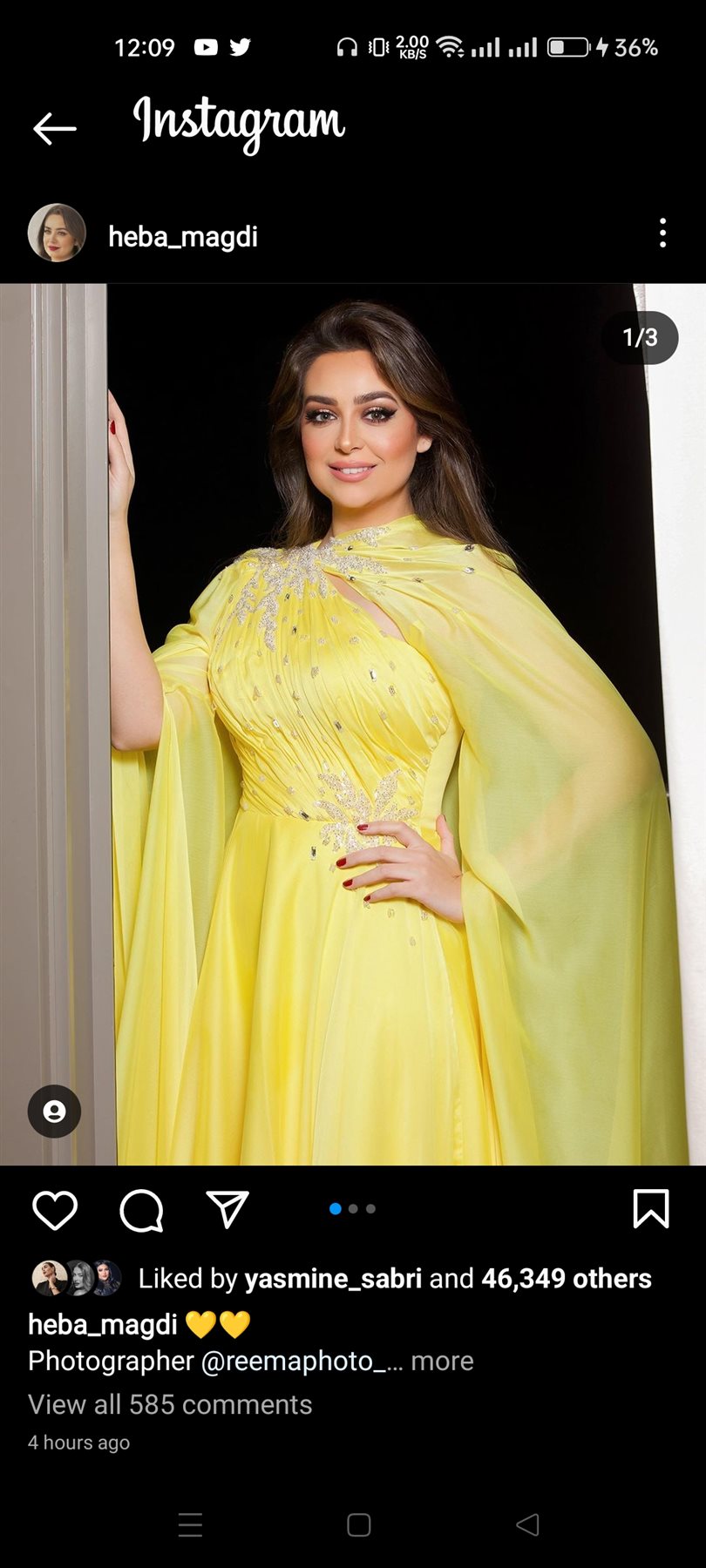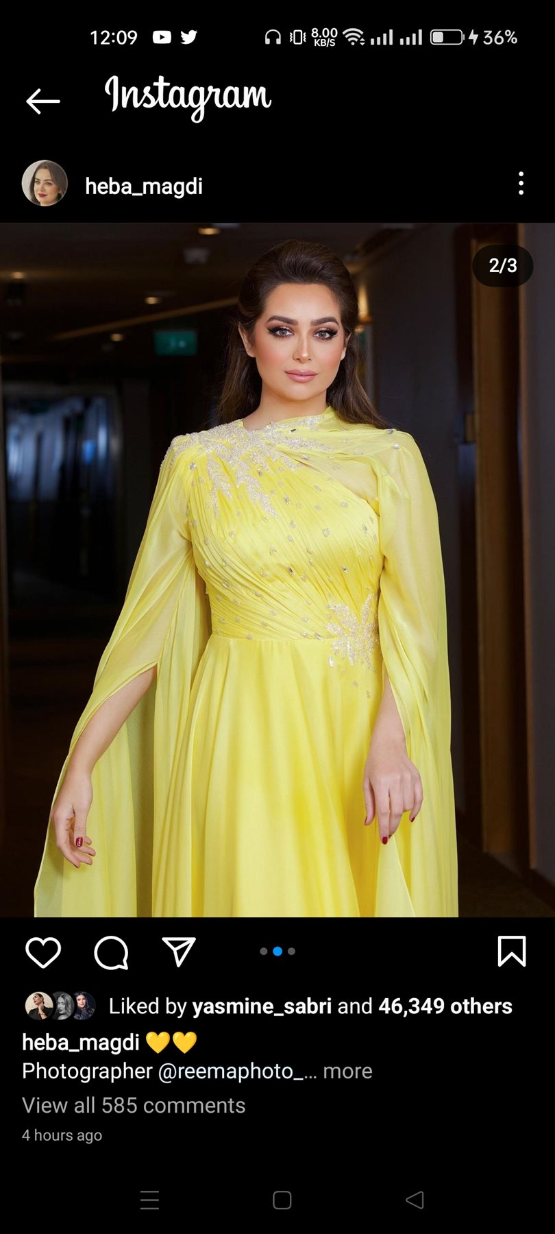 وظهرت هبة مجدي في الصور بإطلالة متميزة ورقيقة، مرتدية فستان محتشم طويل باللون الأصفر الفاتح والمرصع بالالماظ.