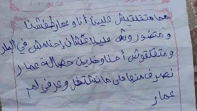 وكتب الطفلين رسالة لوالدة أحدهم " ما تقلقيش علينا انا وعمار طفشنا ومتدوروش علينا علشان احنا مش في البلد ومتقلقوش احنا واخدين حصالة عمار نصرف منها علي ما نشتغل وعرفي ام عمار ".