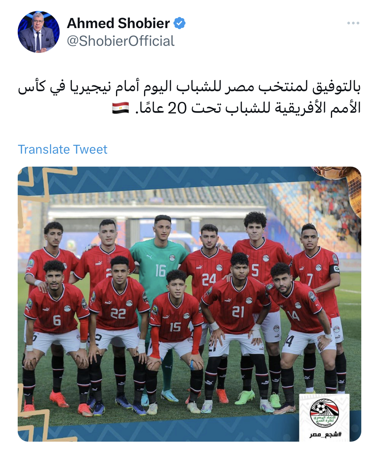 وكتب شوبير في تويتة له: “بالتوفيق لمنتخب مصر للشباب اليوم أمام نيجيريا في كأس الأمم الأفريقية للشباب تحت 20 عامًا”.