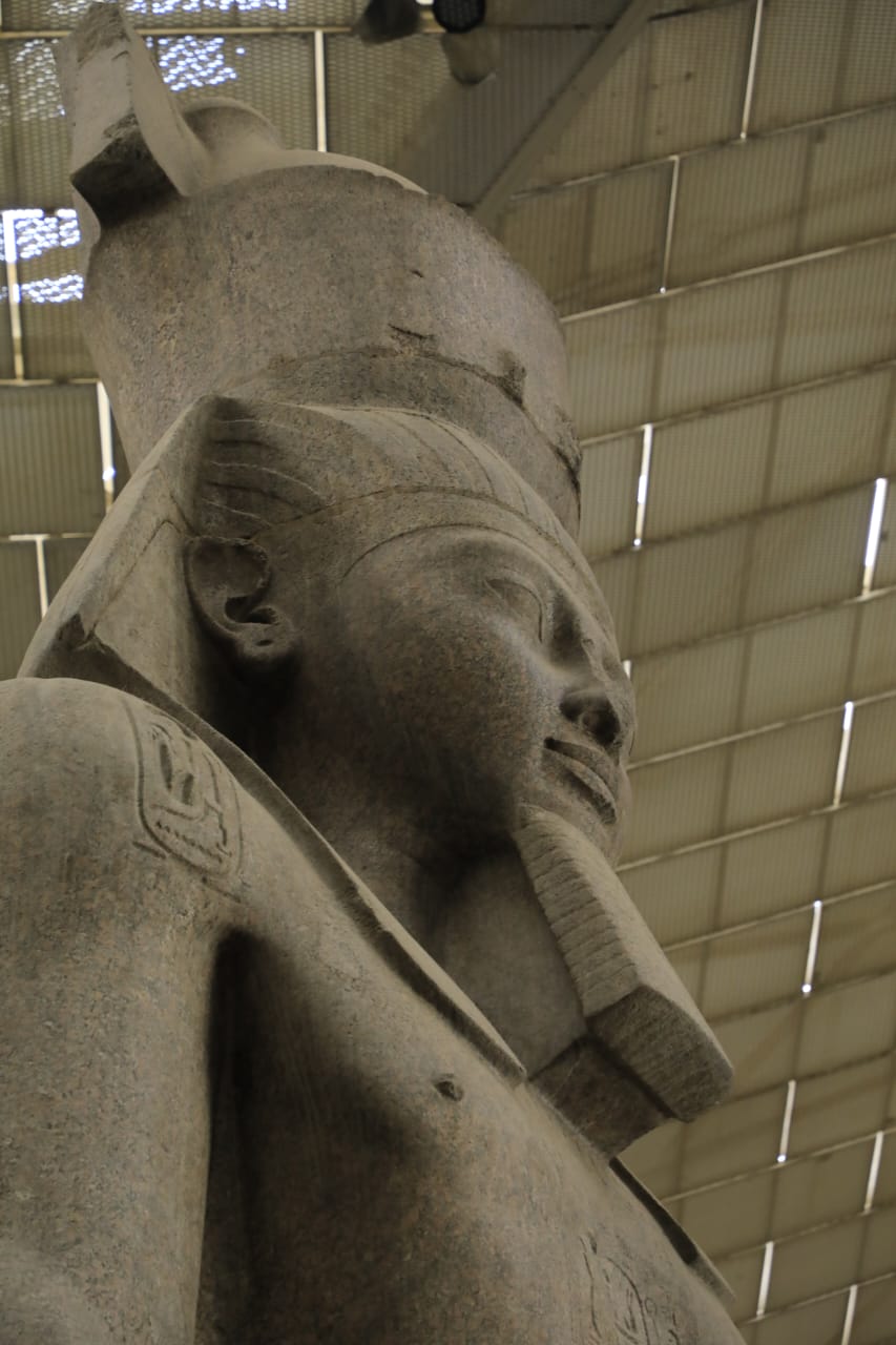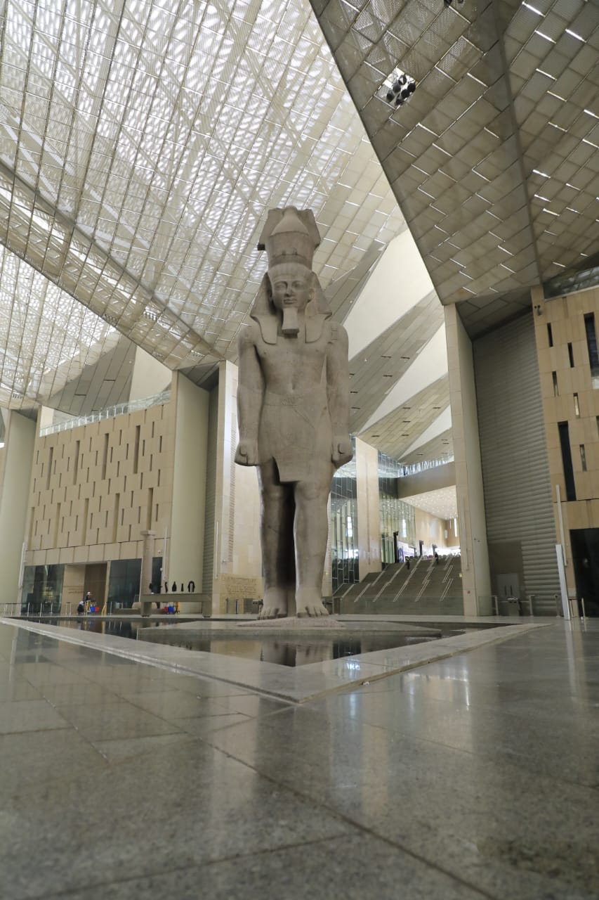 وبنظرك على اليسار ستري الدرج العظيم لـ المتحف المصري الكبير ، ومجموعة من التماثيل المثبتة على مقاعد تنظر اليك في مشهد مهيب مرتبه مبهرة الشكل تصطحبك بنظرها مرة اخري لتعود الى رؤيتك للملك رمسيس الثاني الضخم ، لتعود ادراجك الى زيارة قاعات العرض.
