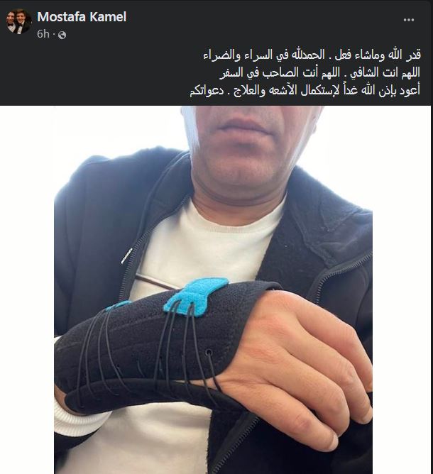 ونشر مصطفى كامل، صورة له وهو يرتدي معصما طبيا على يديه، معلقا على الصورة، "قدر الله وماشاء فعل.. الحمدلله في السراء والضراء..اللهم أنت الشافي .. اللهم أنت الصاحب في السفر.. أعود بإذن الله غداً لاستكمال الأشعة والعلاج".