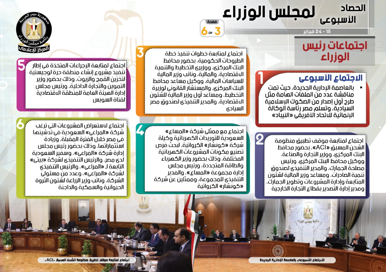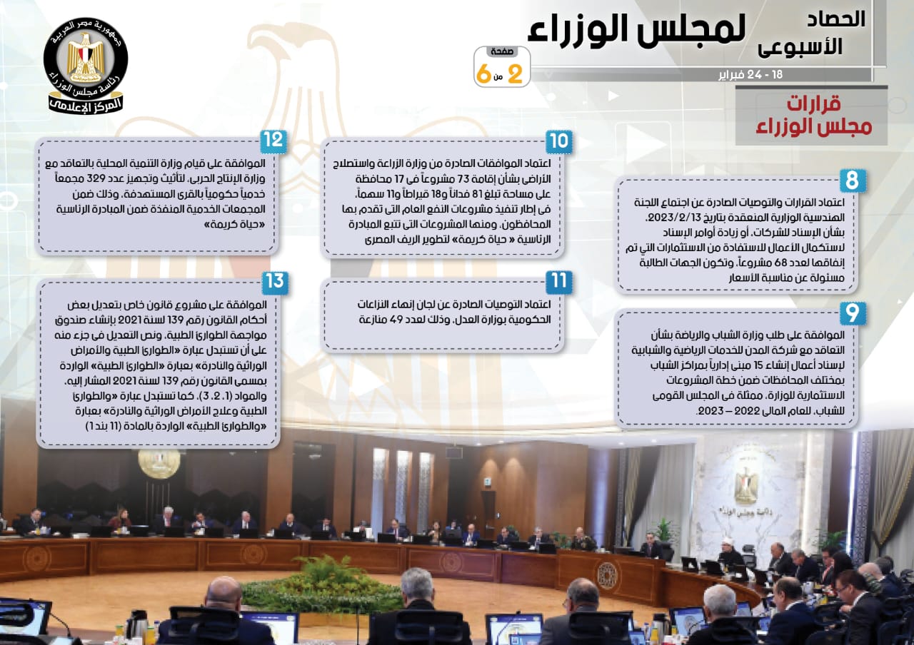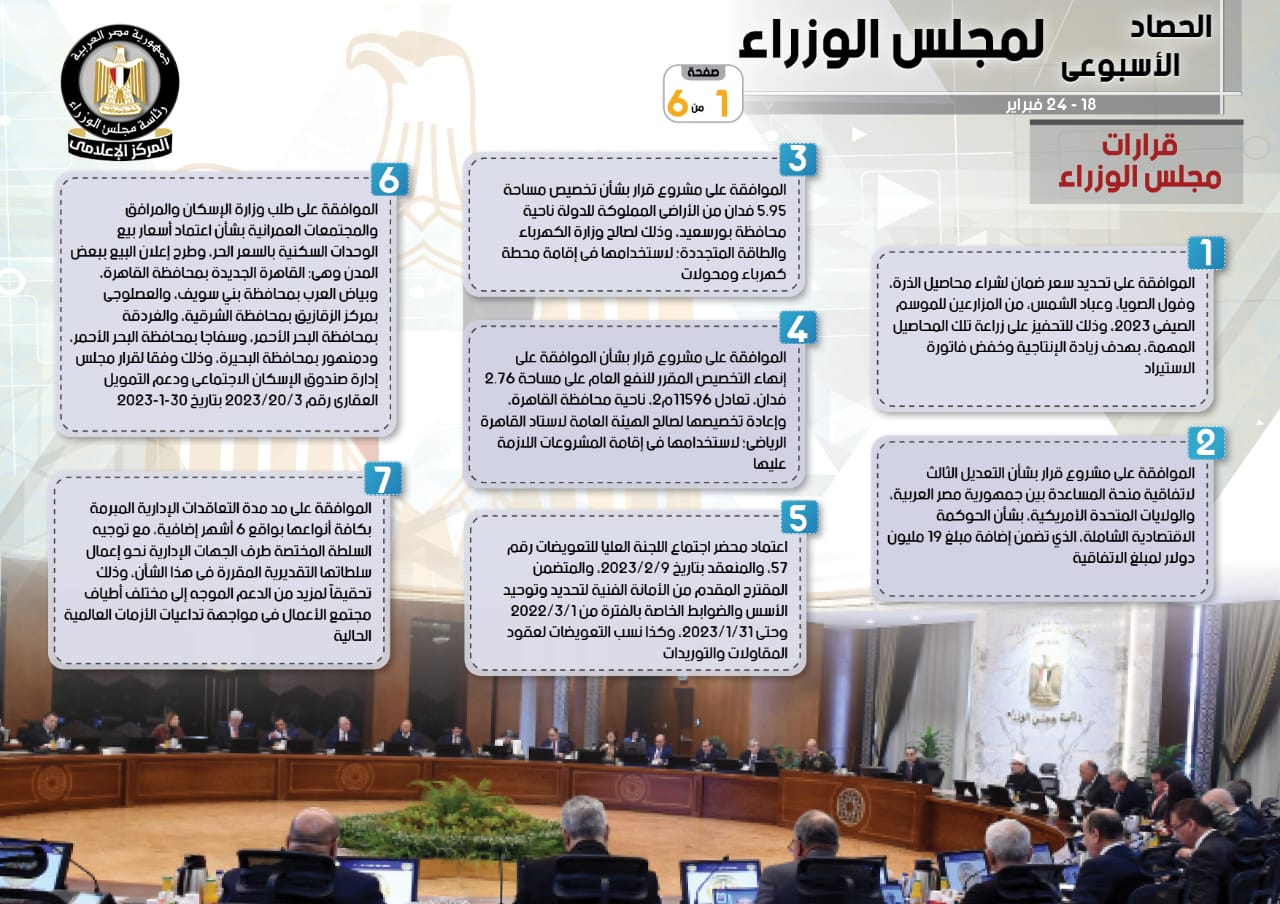 نشر المركز الإعلامي لمجلس الوزراء، تقريراً شمل إنفوجرافات سلط من خلالها الضوء على الحصاد الأسبوعي لمجلس الوزراء، وذلك خلال الفترة من 18 حتى 24 فبراير 2023، والذي تضمن الموافقة على عدد من القرارات، فضلاً عن الاجتماعات واللقاءات التي عقدها الدكتور مصطفى مدبولي، رئيس مجلس الوزراء، بالإضافة إلى ما قام به من أنشطة.