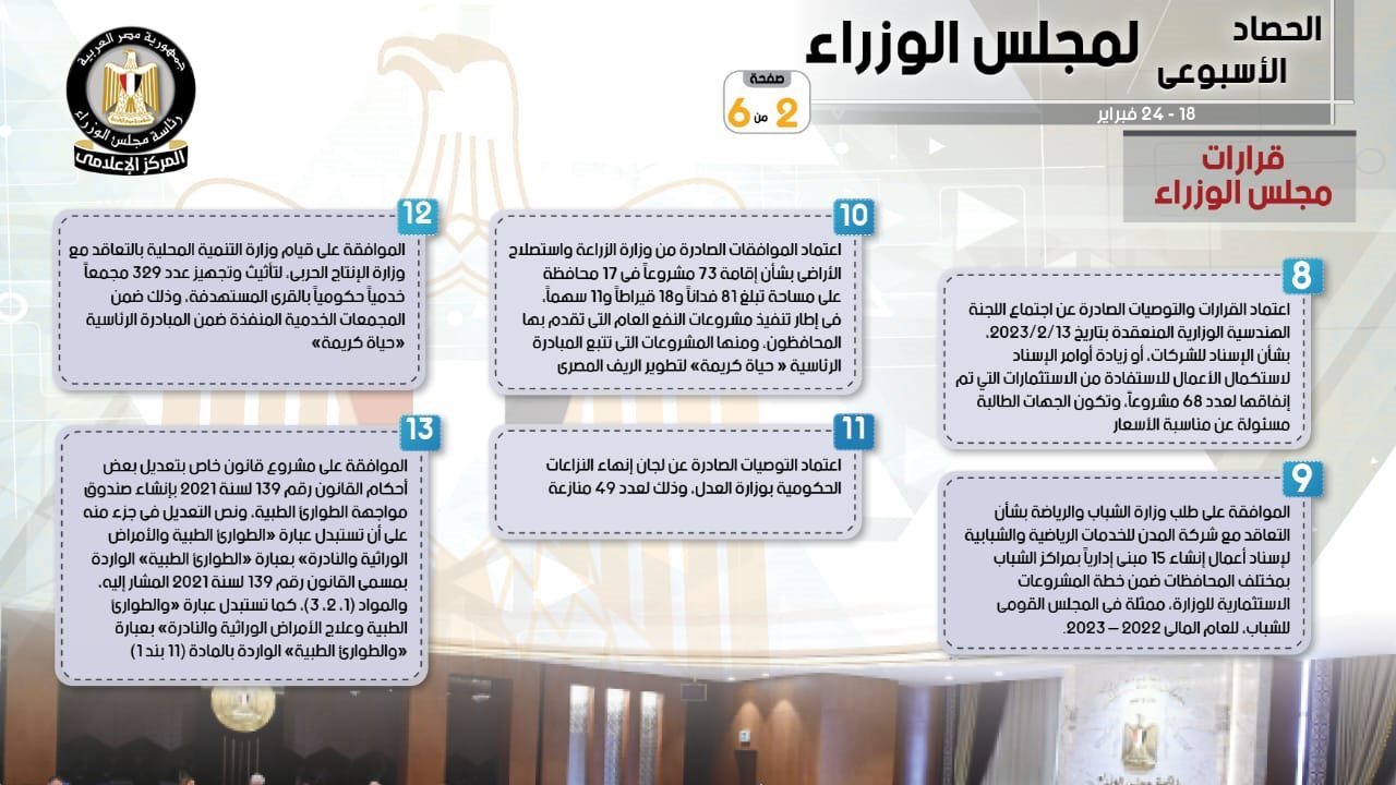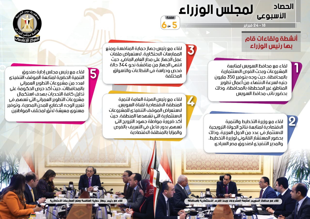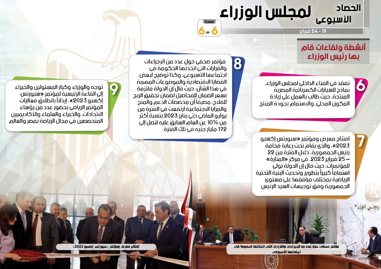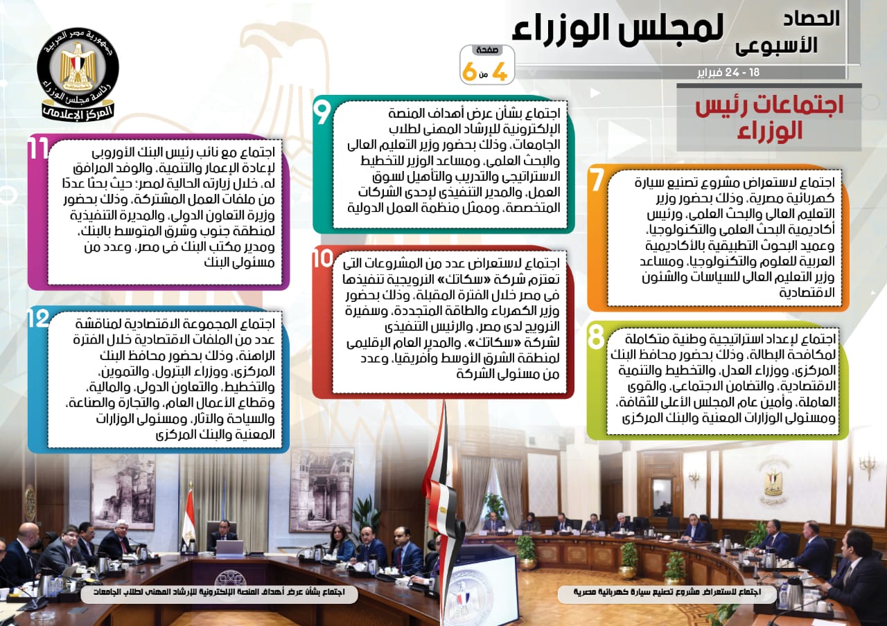 نشر المركز الإعلامي لمجلس الوزراء، تقريراً شمل إنفوجرافات سلط من خلالها الضوء على الحصاد الأسبوعي لمجلس الوزراء، وذلك خلال الفترة من 18 حتى 24 فبراير 2023، والذي تضمن الموافقة على عدد من القرارات، فضلاً عن الاجتماعات واللقاءات التي عقدها الدكتور مصطفى مدبولي، رئيس مجلس الوزراء، بالإضافة إلى ما قام به من أنشطة.