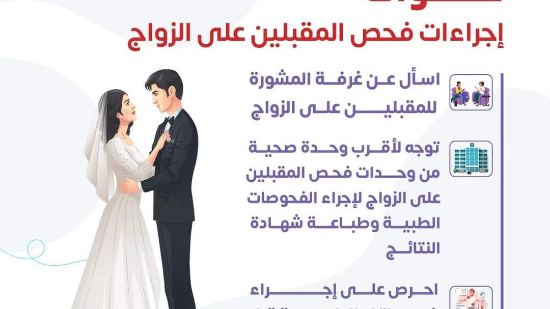 كما كشف مصدر مطلع بوزارة الصحة والسكان، عن موعد انطلاق مبادرة الفحص الطبي للمقبلين على الزواج، والتي من المقرر بدء عمل مبادرة الفحص الطبي للمقبلين على الزواج 26 فبراير الجاري، حيث خاطبت الوزارة مساعد وزير العدل لشئون المحاكم والمطالبات القضائية، لتعميم نموذج الشهادة الطبية المؤمنة المستحدثة على المأذونين ورجال الدين المسيحي الموثقين، والمرخص لهم بإبرام عقود الزواج.