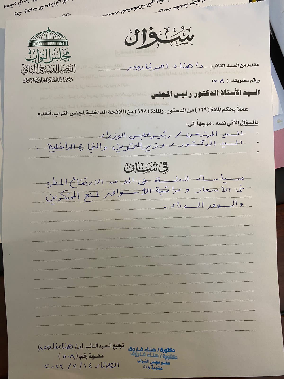 وقالت هناء فاروق فى طلبها، إن الرقابة على الأسواق هى السبيل الوحيد للحد من جشع التجار والقضاء على ارتفاع الأسعار، مطالبة الحكومة بتكثيف حملاتها الرقابية على الأسواق.