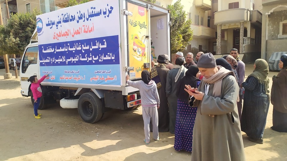 نظمت أمانة الحزب بالمحافظة، قافلة سلع غذائية مكبرة متنقلة، لتجوب كافة مراكز المحافظة، لتوفير السلع الغذائية واللحوم بأسعار مخفضة للمواطنين، بعدد من قرى مركزي الفشن وسمسطا، وتضمنت القافلة 9 سيارات محملة بسلع غذائية مخفضة عن مثيلاتها في الأسواق، والتي شملت عدد 5 سيارات بقرى مركز الفشن، وسيارتين بقرية الشنطور بمركز سمسطا، وسيارتين متنقلتين في الشوارع ودعم القافلة، وشملت السلع التي تضمنتها القافلة المتنقلة: الأرز، السكر، المكرونة، الزيت، تونة، سمن نباتي، وسط إقبال كبير من المواطنين على الشراء.