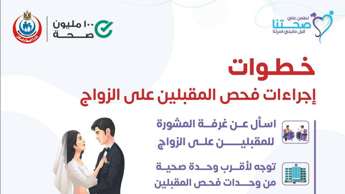 بهدف معرفة حالة طرفا الزواج من الناحية الصحية، ومن ثم عرض تفاصيل حالتهما وتعريفهم بها، ألزمت وزارة الصحة الزوجين بإحراء الفحوصات الطبية الجديدة كشرط أساسي لإتمام عقد الزواج، مؤكدة أنه لن يتم اتخاذ خطوات بدونه، كما أن هذه الفحوصات تتم في مراكز ووحدات يقارب عددها 300 بكافة المحافظات على مستوى الجمهورية.
