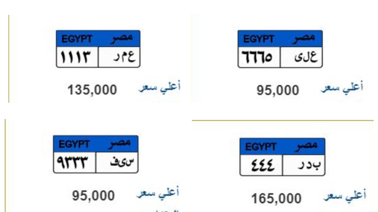 وينتهي المزاد يوم 28 فبراير على كلا من اللوحةن ج د 6666 بسعر 100 ألف جنيه، واللوحة ن ص ف 1111 التي وصل سعرها إلى 100 ألف جنيه، بالاضافة إلى اللوحة م ف م 1 بسعر 400 ألف جنيه، و أ ع م 1111 بسعر 75 ألف جنيه، واللوحة المميزة ج و و 777 بسعر 125 ألف جنيه.