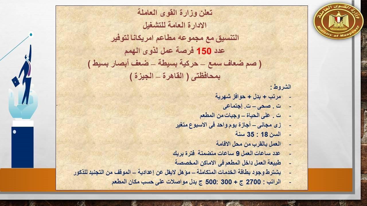 وفرت مديرية القوى العاملة بمحافظتى القاهرة والإسكندرية ؛ ١٨٠ فرصة عمل لذوي الهمم و"الصم والبكم والحركية البسيطة بمجموعة مطاعم امريكانا ،توضح فيه "المديريتين" ، عن إحتياجها لـ 180 فرصة عمل وضعف الأبصار " للأشخاص من ذوي الاعاقة، و"الصم والبكم والحركية البسيطة وضعف الابصار " من أبناء المحافظتين؛ وذلك بما يتناسب مع متطلبات العمل داخل الشركتين.