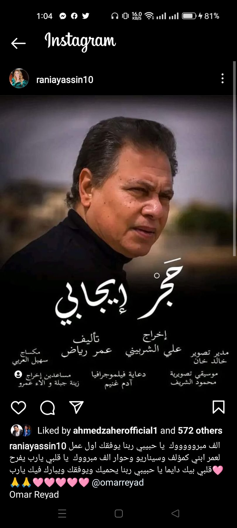 هنأت الفنانة رانيا محمود ياسين ابنها بمناسبة أول عمل كتأليف وسيناريو عبر صفحتها على موقع التواصل الاجتماعي لتبادل الصور والفيديوهات القصيرة إنستجرام.
