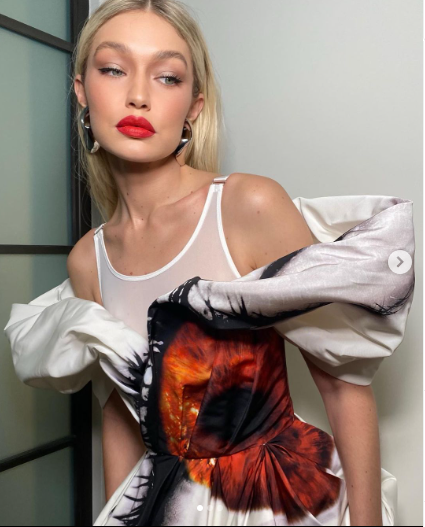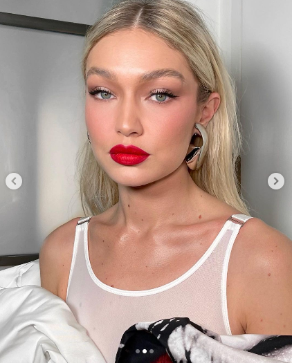 وأكملت جيجي حديد إطلالتها ببعض اللمسات الناعمة من المكياج، فقامت بوضع اللون الأحمر الناري كأحمر شفاه، مع الآي لاينر والآي شادو بألوان ناعمة والماسكرا، وهو ما تناسب مع لون بشرتها.