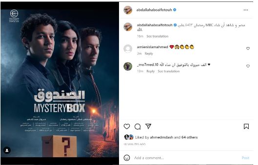 وكان طرح القائمون على مسلسل “الصندوق” البوسترات الدعائية لأبطال العمل، الذي من المقرر أن يعرض خلال الموسم الرمضاني المقبل 2023 على إحدى المنصات الرقمية الشهيرة وقناة mbc مصر، حيث تصدر كل بطل من الأبطال البوسترات منفردًا وهم أحمد داش وهدى المفتي وعلي قاسم.