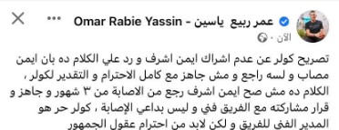 وكتب عمر ربيع ياسين عبر صفحته الشخصية على موقع التواصل الاجتماعي “فيس بوك”:" تصريح كولر عن عدم مشاركة أيمن أشرف ورده بأن أيمن مصاب لسه راجع ومش جاهز مع كامل الاحترام والتقدير لكولر، الكلام ده مش صح".