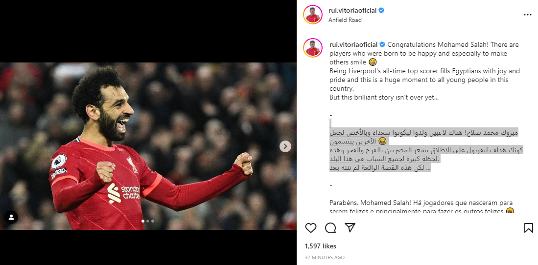 وكتب فيتوريا في منشور له: “مبروك محمد صلاح! هناك لاعبين ولدوا ليكونوا سعداء وبالأخص لجعل الآخرين يبتسمون كونك هداف ليفربول على الإطلاق يشعر المصريين بالفرح والفخر وهذه لحظة كبيرة لجميع الشباب في هذا البلد. لكن هذه القصة الرائعة لم تنته بعد”.