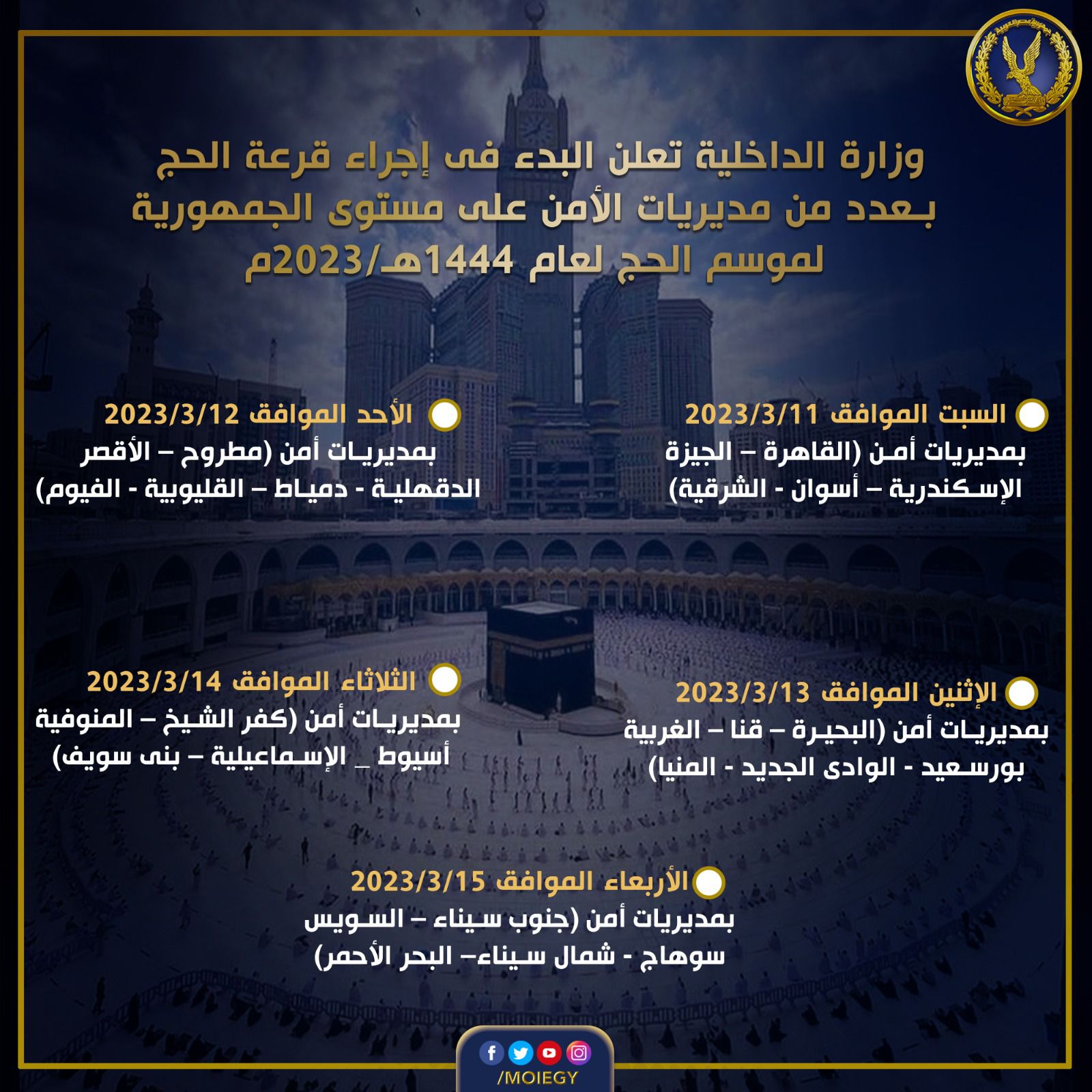 والمقرر إجراء القرعة الإلكترونية العلنية مركزيًا على بوابة الحج المصرية الموحدة وبحضور ممثلين عن كل محافظة خلال النصف الأول من شهر إبريل المقبل، وتعلن النتائج النهائية للقرعة "أصلي- احتياطي بنسبة 30%" على الموقع الإلكتروني للوزارة والمؤسسة القومية لتيسير الحج وتنشر بالمديريات والإدارات الاجتماعية.