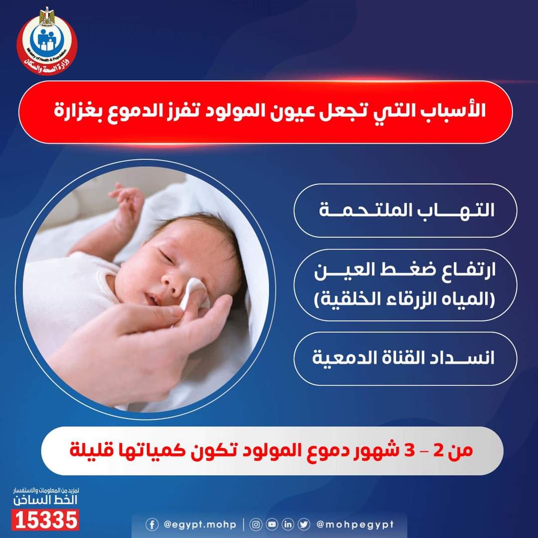 واوضحت وزارة الصحة والسكان من خلال منشورها التوعوي أن دموع الاطفال حديثي الولادة من عمر شهرين إلي ٣ شهور تكون كمياتها قليلة .