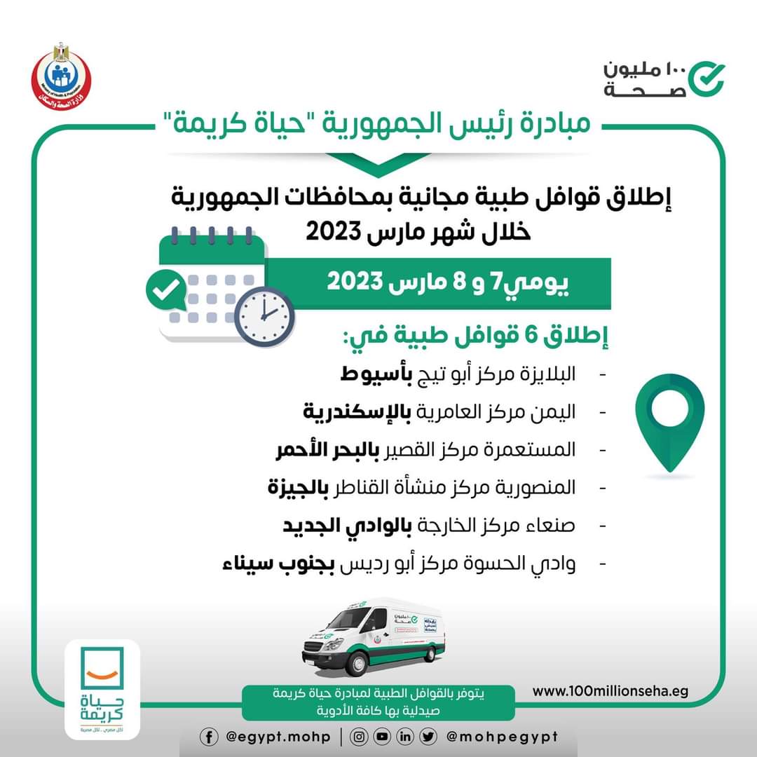 أعلنت وزارة الصحة والسكان إطلاق ٦ قوافل طبية ضمن مبادرة رئيس الجمهورية حياة كريمة بعدد من محافظات الجمهورية.