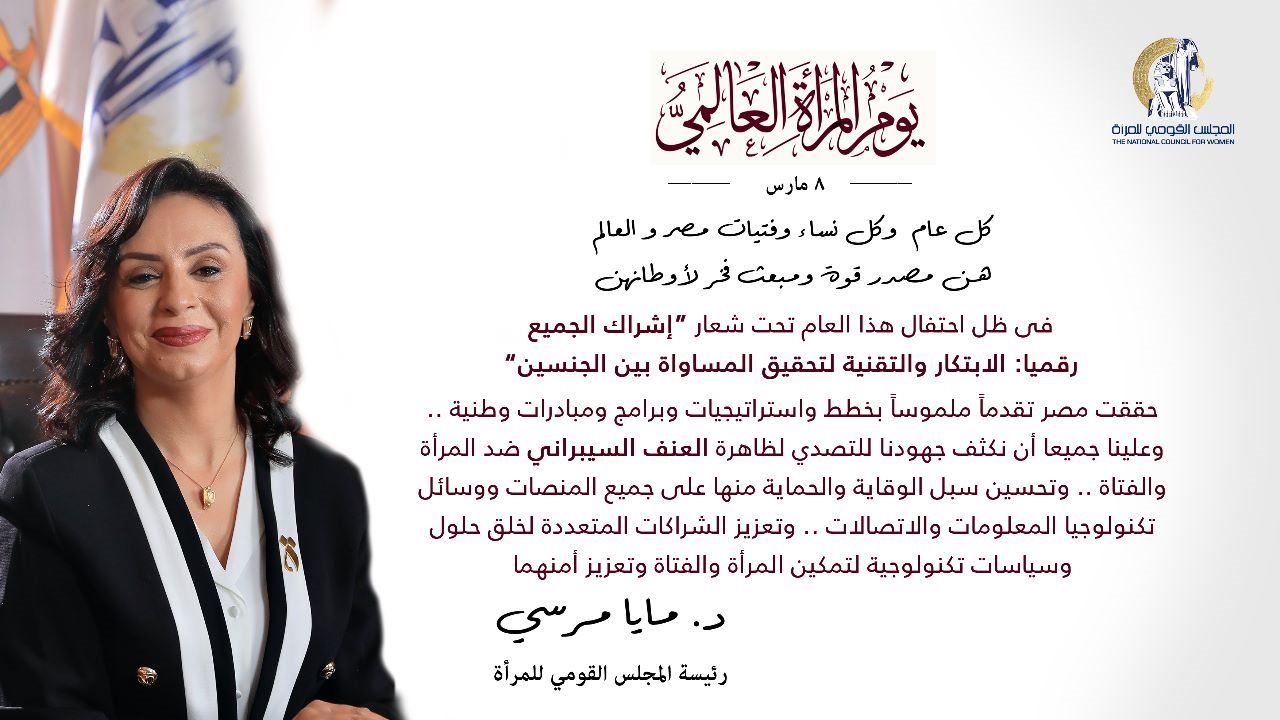 وأضافت رئيسة المجلس القومى للمرأة، فى رسالتها بمناسبة اليوم العالمى للمرأة، أنه في ظل احتفال هذا العام تحت شعار "إشراك الجميع رقميا: الابتكار والتقنية لتحقيق المساواة بين الجنسين"، حققت مصر تقدماً ملموساً بخطط واستراتيجيات وبرامج ومبادرات وطنية.