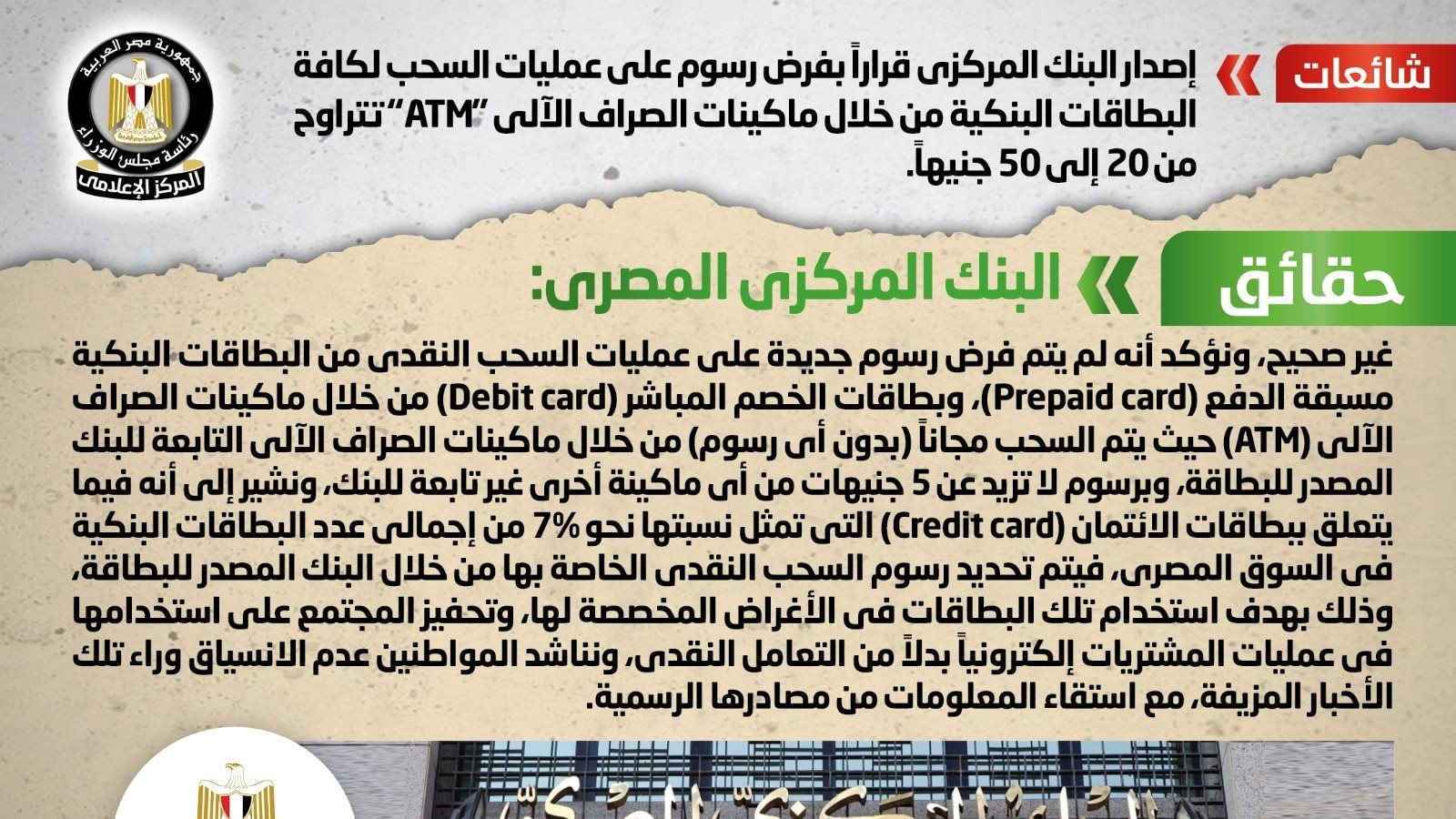 تداولت بعض المواقع الإلكترونية وصفحات التواصل الاجتماعي أنباء بشأن إصدار البنك المركزي قراراً بفرض رسوم على عمليات السحب لكافة البطاقات البنكية من خلال ماكينات الصراف الآلي "ATM" تتراوح من 20 إلى50 جنيهاً، وقد قام المركز الإعلامي لمجلس الوزراء بالتواصل مع البنك المركزي المصري، والذي نفى تلك الأنباء، مُؤكداً أنه لا صحة لفرض رسوم جديدة على عمليات السحب النقدي من البطاقات البنكية مسبقة الدفع (Prepaid card) وبطاقات الخصم المباشر (Debit card) من خلال ماكينات الصراف الآلي (ATM) حيث يتم السحب مجاناً (بدون أي رسوم) من خلال ماكينات الصراف الآلي التابعة للبنك المصدر للبطاقة، وبرسوم لا تزيد عن 5 جنيهات من أي ماكينة أخرى غير تابعة للبنك، مشيراً إلى أنه فيما يتعلق ببطاقات الائتمان (Credit card) التي تمثل نسبتها نحو 7% من إجمالي عدد البطاقات البنكية في السوق المصري، فيتم تحديد رسوم السحب النقدي الخاصة بها من خلال البنك المصدر للبطاقة، وذلك بهدف استخدام تلك البطاقات في الأغراض المخصصة لها، وتحفيز المجتمع على استخدامها في عمليات المشتريات إلكترونياً بدلاً من التعامل النقدي، مُناشداً المواطنين عدم الانسياق وراء تلك الأخبار المزيفة، مع استقاء المعلومات من مصادرها الرسمية.