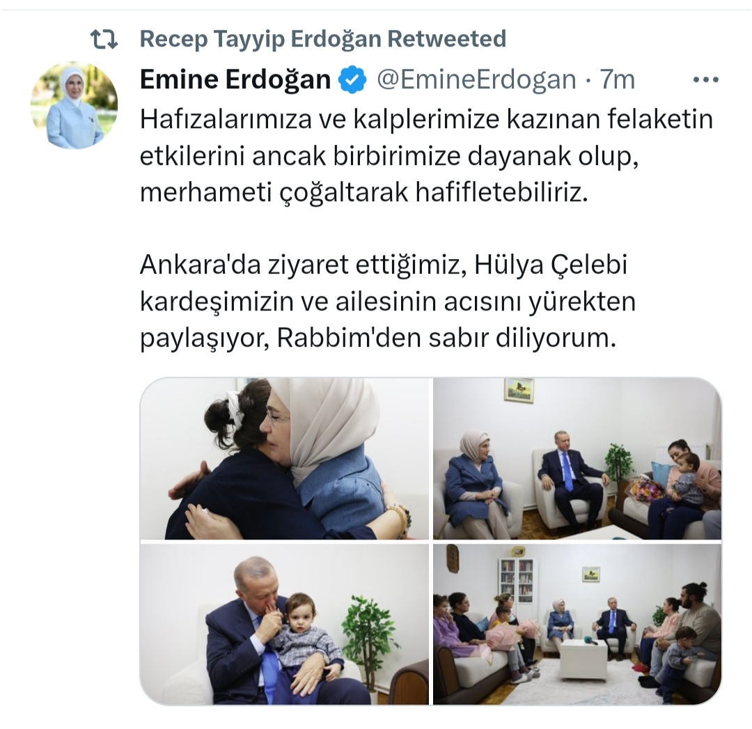 واضافت السيدة الاولي لتركيا:" أشارك من صميم قلب أخينا هوليا جلبي الذي قمنا بزيارته في أنقرة وعائلته ، وأطلب من ربي الصبر".
