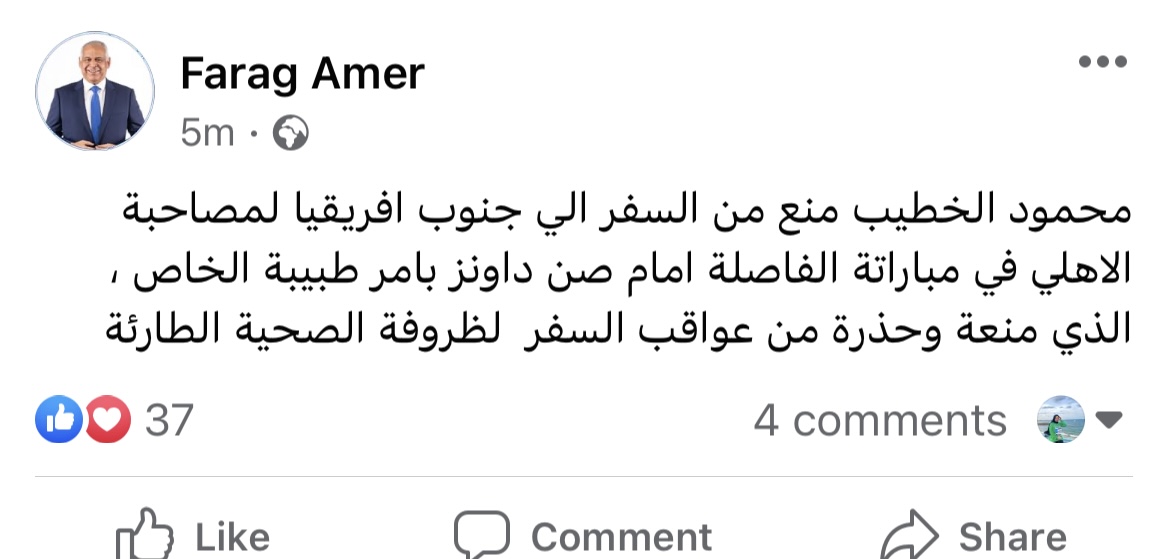 وكتب عبر فيسبوك: “محمود الخطيب منع من السفر إلي جنوب افريقيا لمصاحبة الاهلي في مباراته الفاصلة امام صن داونز بامر طبيبة الخاص، الذي منعة وحذره من عواقب السفر لظروفه الصحية الطارئة”.