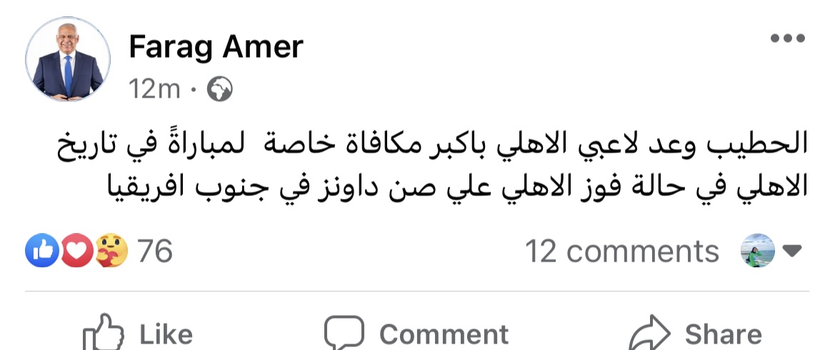 وتابع: "الخطيب وعد لاعبي الاهلي باكبر مكافاة خاصة لمباراةً في تاريخ الاهلي في حالة فوز الاهلي علي صن داونز في جنوب افريقيا".