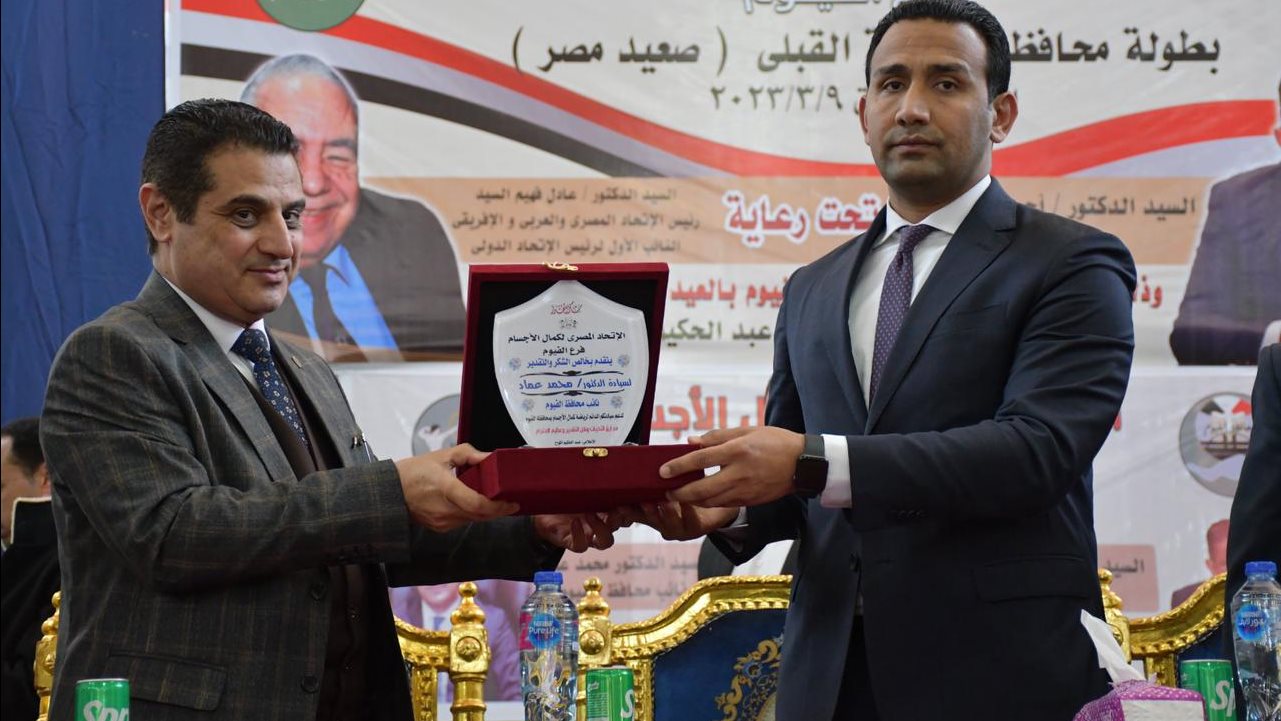 كان الدكتور محمد عماد نائب محافظ الفيوم، قد شهد ختام منافسات بطولة محافظات الوجه القبلي "صعيد مصر" لكمال الأجسام، التي أقيمت بمقر جمعية الشبان المسلمين العالمية بمدينة الفيوم، بمشاركة 250 لاعباً، يمثلون 10 محافظات، بحضور الدكتور محمود درويش عضو مجلس إدارة الاتحاد المصري لكمال الأجسام، والدكتور عاصم مرسي وكيل وزارة الشباب والرياضة بالفيوم، والمستشار محمود الهواري رئيس مجلس إدارة جمعية الشبان المسلمين العالمية بالفيوم والاعلامى عبدالحكيم اللواج رئيس منطقة الفيوم لكمال الأجسام، والمستشار عامر أحمد عامر رئيس منطقة بنى سويف.