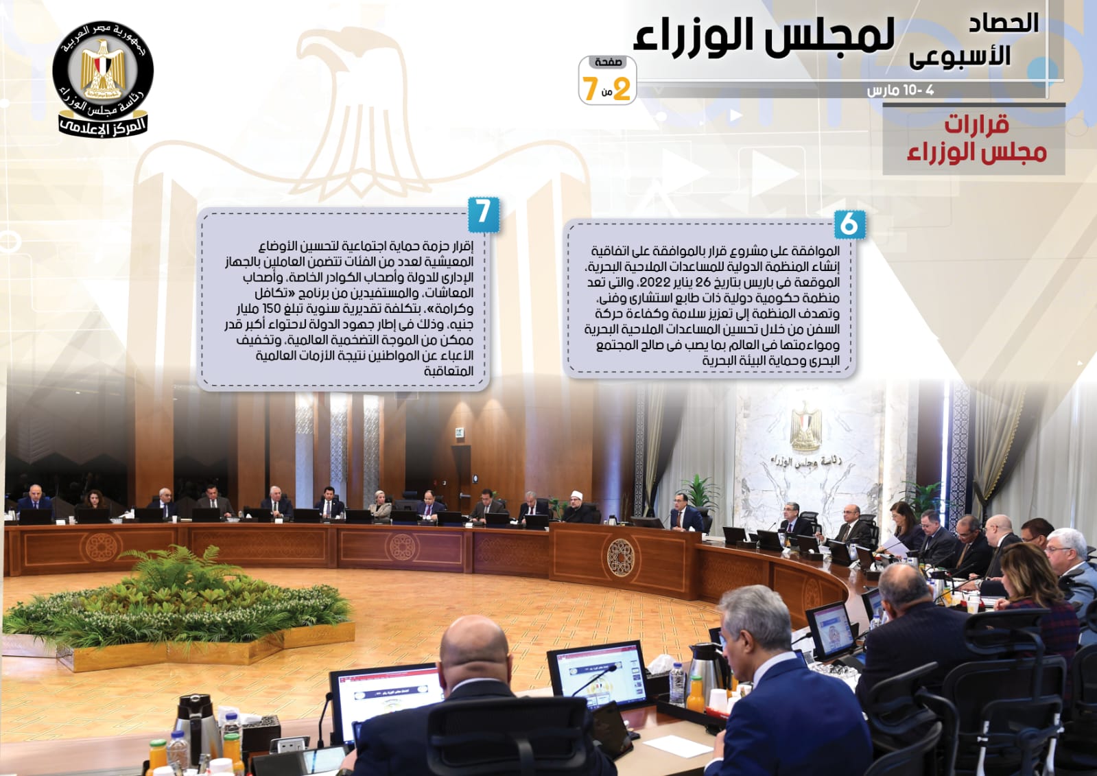 كما تضمنت القرارت أيضاً كما أظهر التقرير، إقرار حزمة حماية اجتماعية لتحسين الأوضاع المعيشية لعدد من الفئات تتضمن العاملين بالجهاز الإداري للدولة وأصحاب الكوادر الخاصة، وأصحاب المعاشات، والمستفيدين من برنامج "تكافل وكرامة"، بتكلفة تقديرية سنوية تبلغ 150 مليار جنيه، وذلك في إطار جهود الدولة لاحتواء أكبر قدر ممكن من الموجة التضخمية العالمية، وتخفيف الأعباء عن المواطنين نتيجة الأزمات العالمية المتعاقبة، إلى جانب تكليف باتخاذ الإجراءات التنفيذية اللازمة، لإطلاق اسم "اللواء سمير فرج" على محور جار تنفيذه شمال مطار الأقصر، تنفيذاً لتوجيهات رئيس الجمهورية، ويأتي هذا القرارعرفاناً لما بذله من جهود واضحة لخدمة المحافظة وأبنائها.