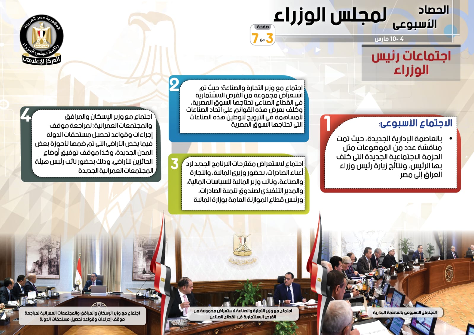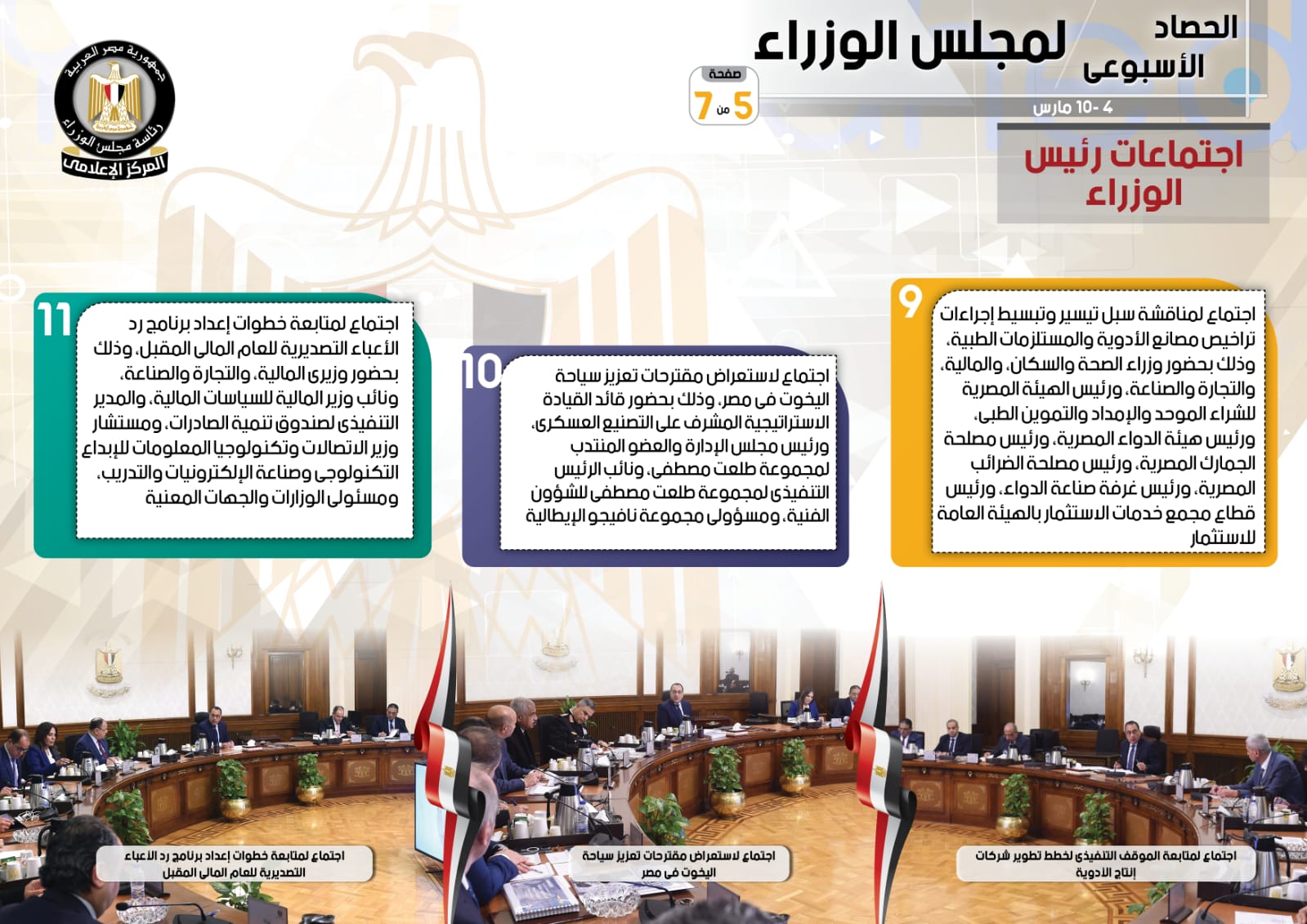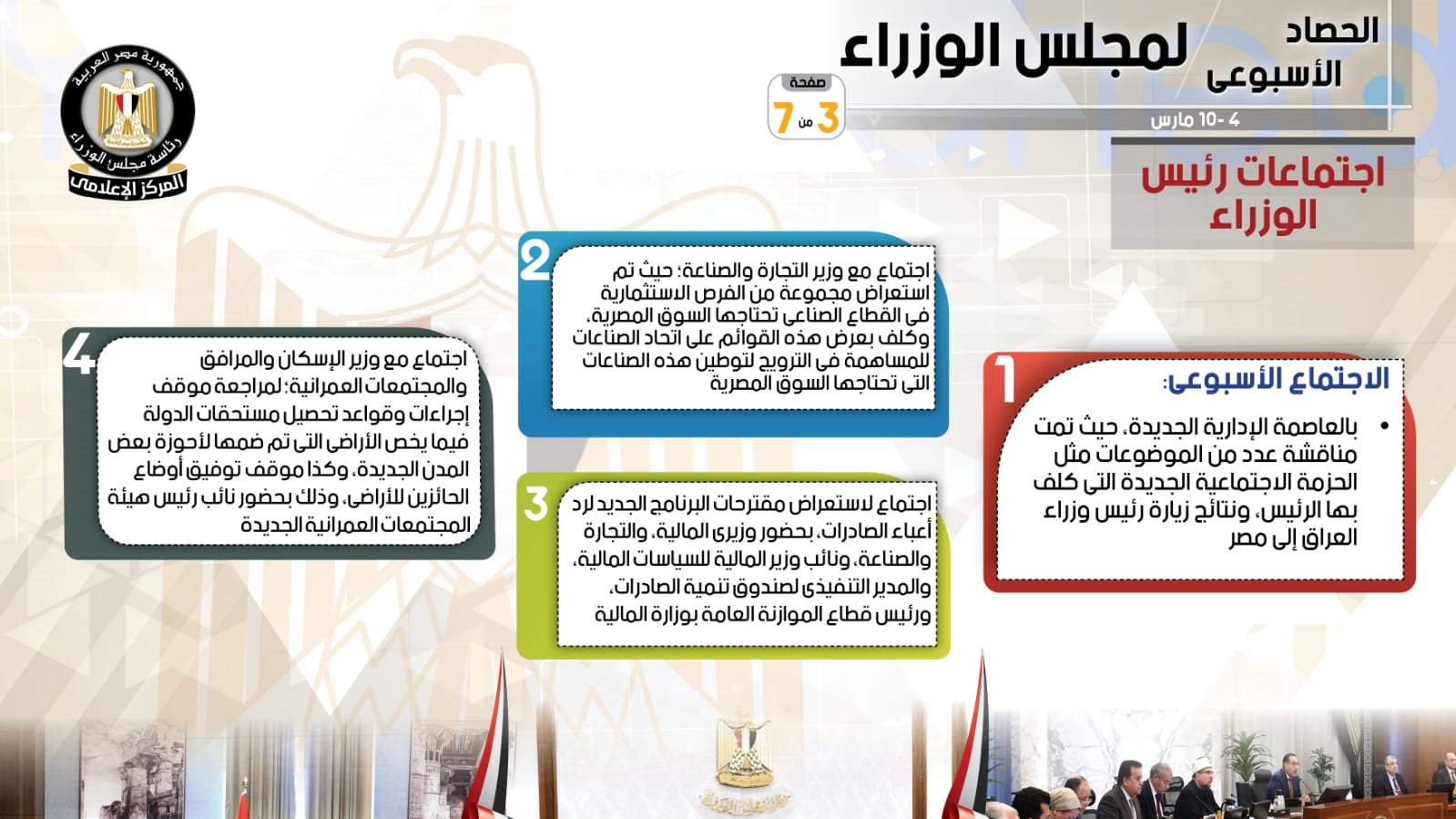 وعلى صعيد الاجتماعات التي عقدها رئيس مجلس الوزراء، أوضح التقرير أنه تم عقد اجتماع مع وزير التجارة والصناعة؛ حيث تم استعراض مجموعة من الفرص الاستثمارية في القطاع الصناعي تحتاجها السوق المصرية، وكلف بعرض هذه القوائم على اتحاد الصناعات للمساهمة في الترويج لتوطين هذه الصناعات التي تحتاجها السوق المصرية، إلى جانب اجتماع لمتابعة خطوات إعداد برنامج رد الأعباء التصديرية للعام المالي المقبل، وذلك بحضور وزيري المالية، والتجارة والصناعة، ونائب وزير المالية للسياسات المالية، والمدير التنفيذي لصندوق تنمية الصادرات، ومستشار وزير الاتصالات وتكنولوجيا المعلومات للإبداع التكنولوجي وصناعة الإلكترونيات والتدريب، ومسئولي الوزارات والجهات المعنية، وكذلك اجتماع لاستعراض مقترحات تعزيز سياحة اليخوت في مصر، وذلك بحضور قائد القيادة الاستراتيجية المشرف على التصنيع العسكري، ورئيس مجلس الإدارة والعضو المنتدب لمجموعة طلعت مصطفى، ونائب الرئيس التنفيذي لمجموعة طلعت مصطفى للشؤون الفنية، ومسؤولي مجموعة نافيجو الإيطالية.