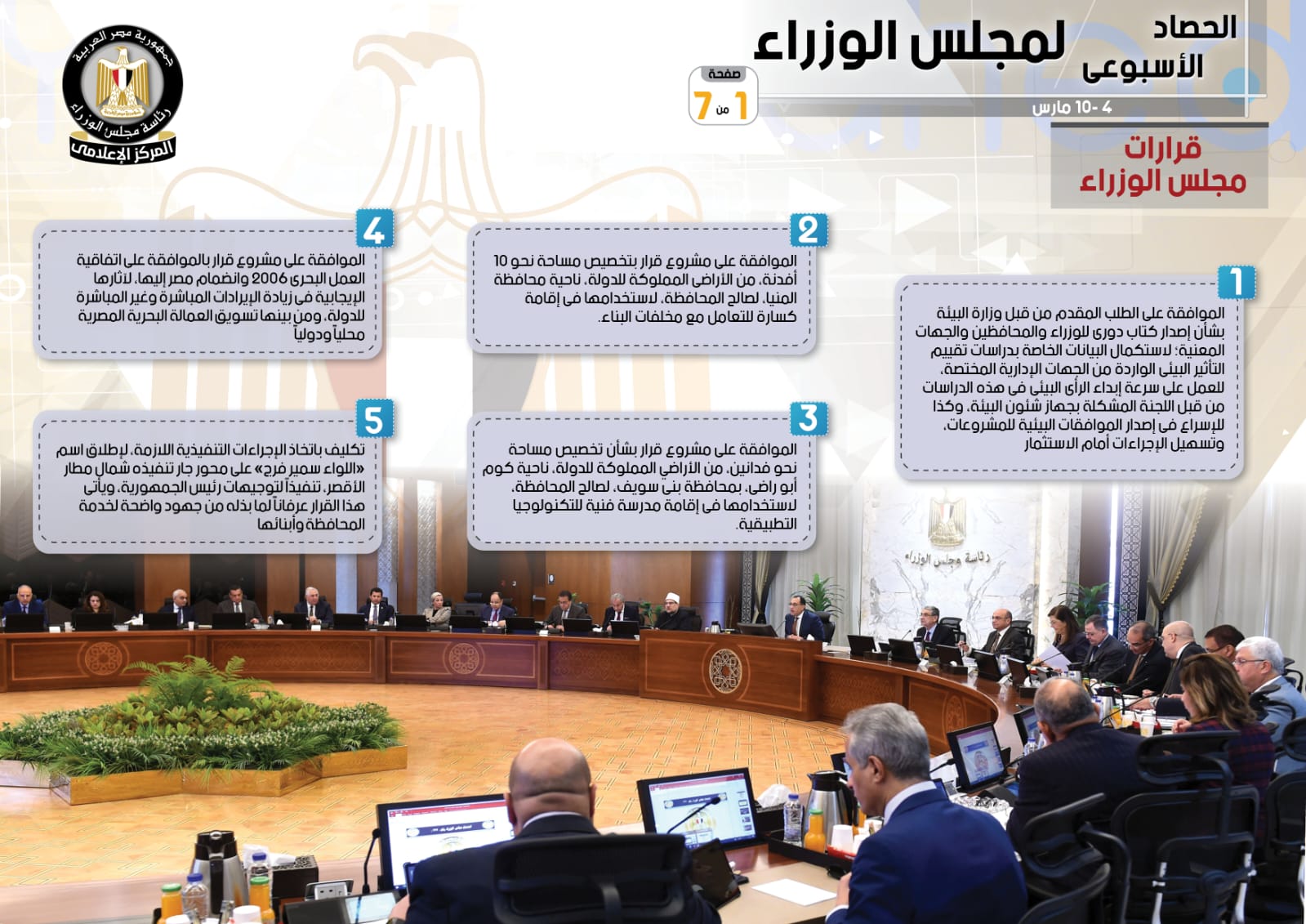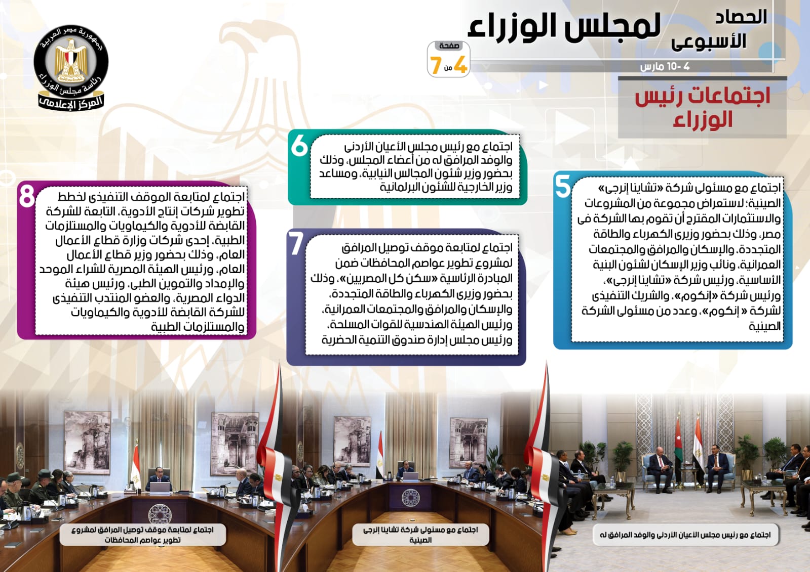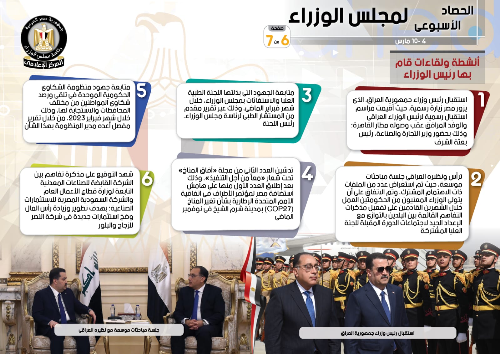 نشر المركز الإعلامي لمجلس الوزراء، تقريراً شمل إنفوجرافات سلط من خلالها الضوء على الحصاد الأسبوعي لمجلس الوزراء، وذلك خلال الفترة من من 4 حتى 10مارس2023، والذي تضمن الموافقة على عدد من القرارات، فضلاً عن الاجتماعات التي عقدها الدكتور مصطفى مدبولي، رئيس مجلس الوزراء، بالإضافة إلى ما قام به من أنشطة.