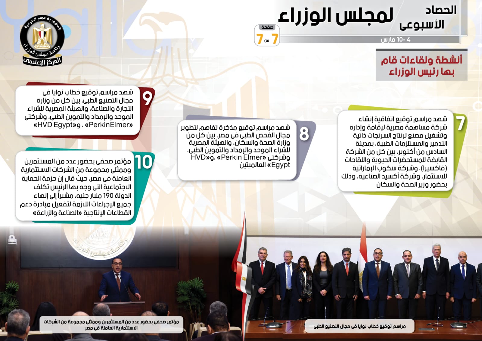 واستكمالاً لأنشطة رئيس مجلس الوزراء، أورد التقرير عقد مؤتمر صحفي بحضور عدد من المستثمرين وممثلي مجموعة من الشركات الاستثمارية العاملة في مصر، حيث قال إن حزمة الحماية الاجتماعية التي وجه بها الرئيس تكلف الدولة 190 مليار جنيه، مشيراً إلى إنهاء جميع الإجراءات اللازمة لتفعيل مبادرة دعم القطاعات الإنتاجية "الصناعة والزراعة"، كما شهد مراسم توقيع خطاب نوايا في مجال التصنيع الطبي، بين كل من وزارة التجارة والصناعة، والهيئة المصرية للشراء الموحد والإمداد والتموين الطبي، وشركتي "PerkinElmer "، و"HVD Egypt".