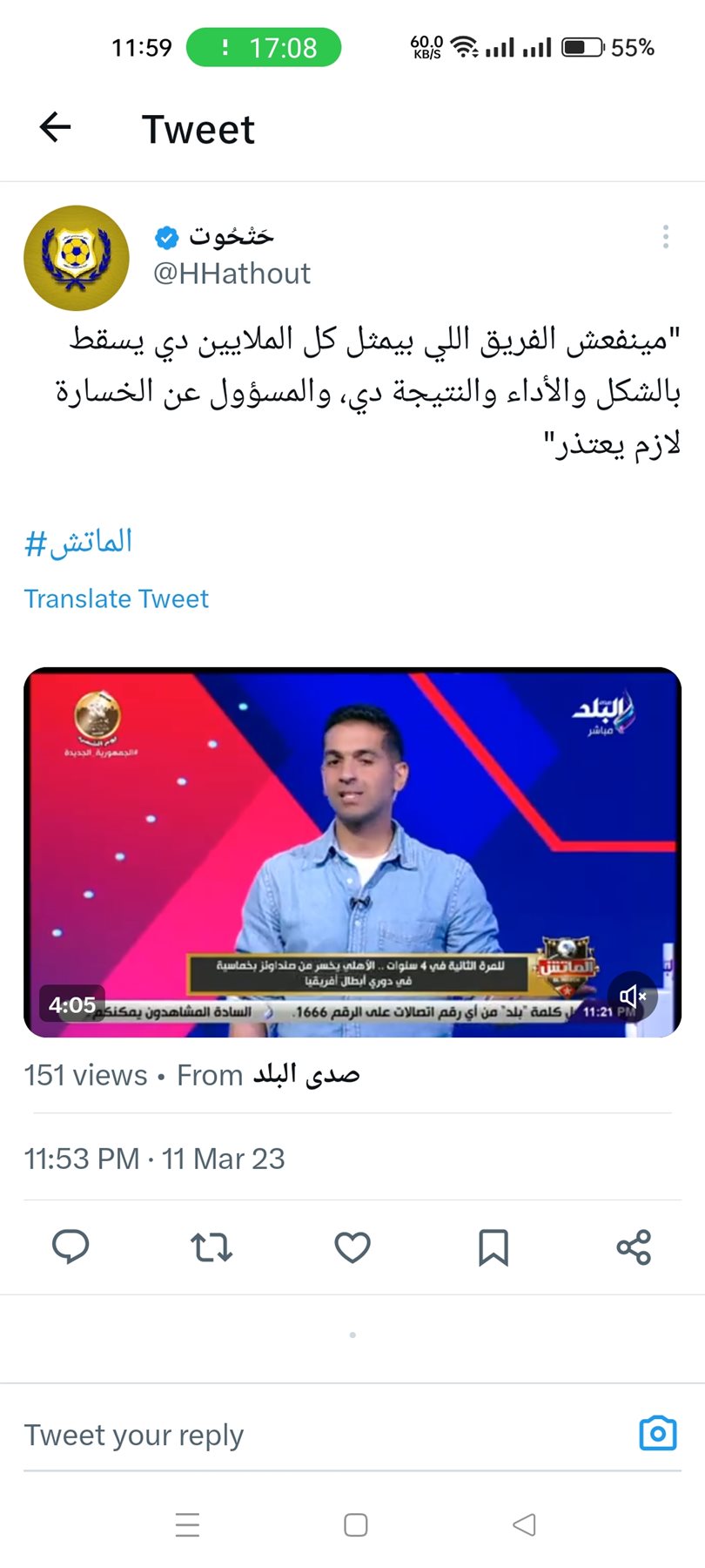 وكتب حتحوت:""مينفعش الفريق اللي بيمثل كل الملايين دي يسقط بالشكل والأداء والنتيجة دي، والمسؤول عن الخسارة لازم يعتذر".