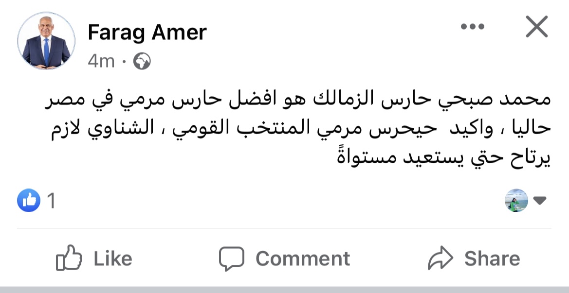 وكتب: "محمد صبحي حارس الزمالك هو افضل حارس مرمي في مصر حاليا، وأكيد سيحرص مرمي المنتخب القومي، الشناوي لازم يرتاح حتي يستعيد مستواه".