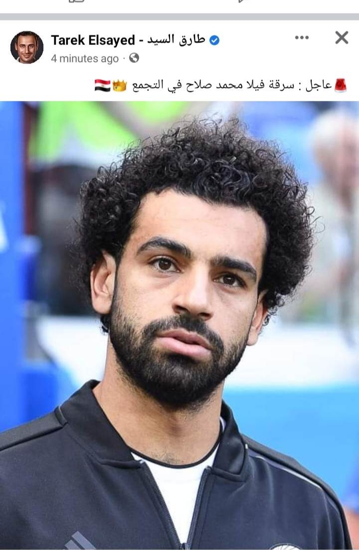 وكتب طارق السيد، نجم منتخب مصر والزمالك السابق عبر صفحته الرسمية على موقع التواصل الاجتماعي فيسبوك، أن الفيلا الخاصة بمحمد صلاح تعرّضت للسرقة.