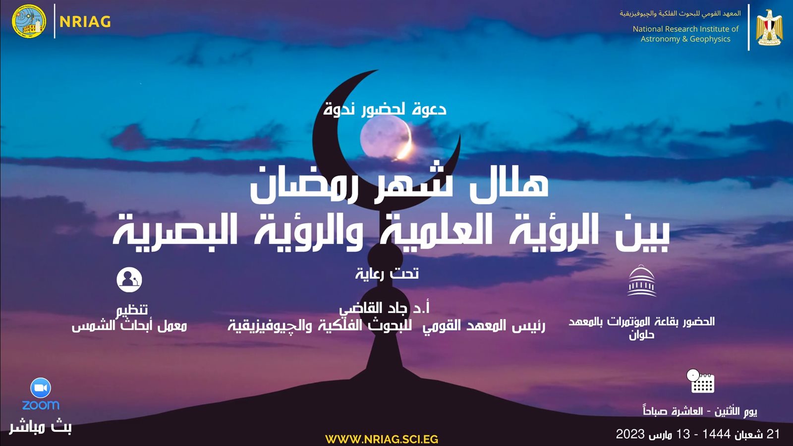 ينظم معمل ابحاث الشمس بالمعهد القومى للبحوث الفلكية والجيوفيزيقية، الآن، ندوة تثقيفية بعنوان (هلال شهر رمضان بين الرؤية العلمية والرؤية البصرية) ويأتي ذلك في اطار الدور المجتمعى والبحثى المنوط به .
