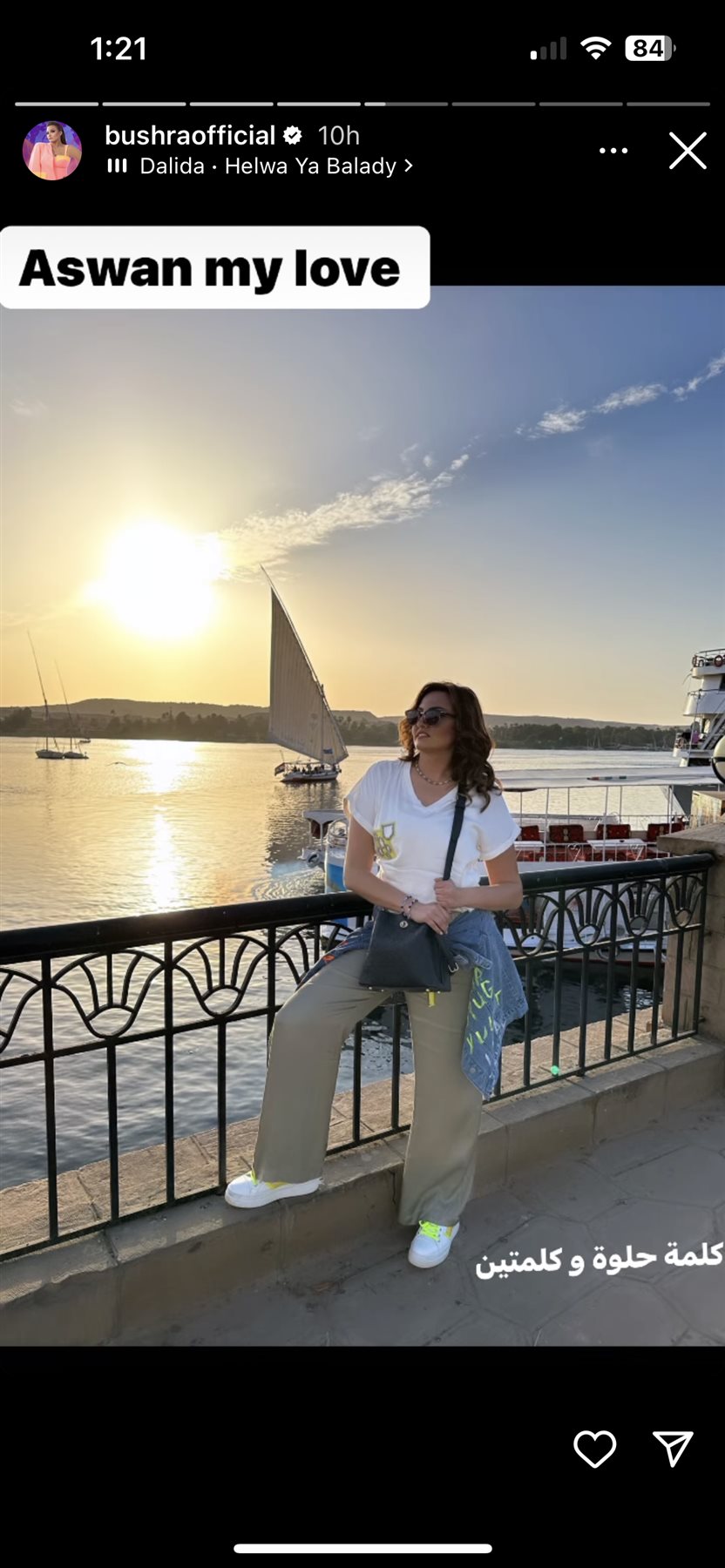 وظهرت بشرى بـ لوك كاجوال صيفي، من أسوان، معبرة عن حبها الشديد، بصورة وقت الغروب على نهر النيل.